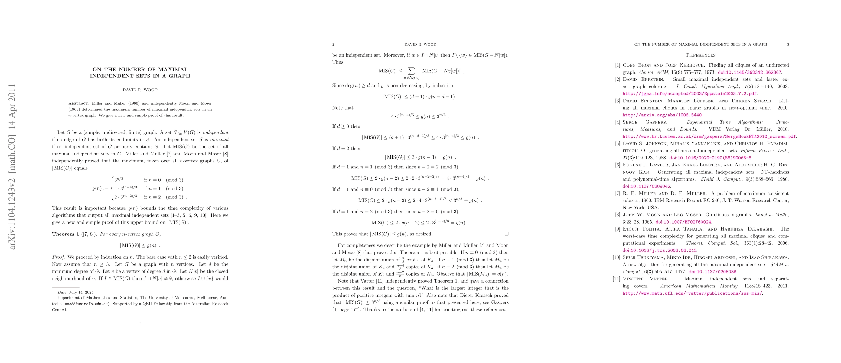 This paper provides a new and straightforward proof of the established result that determines the maximum number of maximal independent sets in an $n$-vertex graph, originally found by Miller and Muller (1960) and Moon and Moser (1965). The authors present a simpler approach to this well-known theorem.