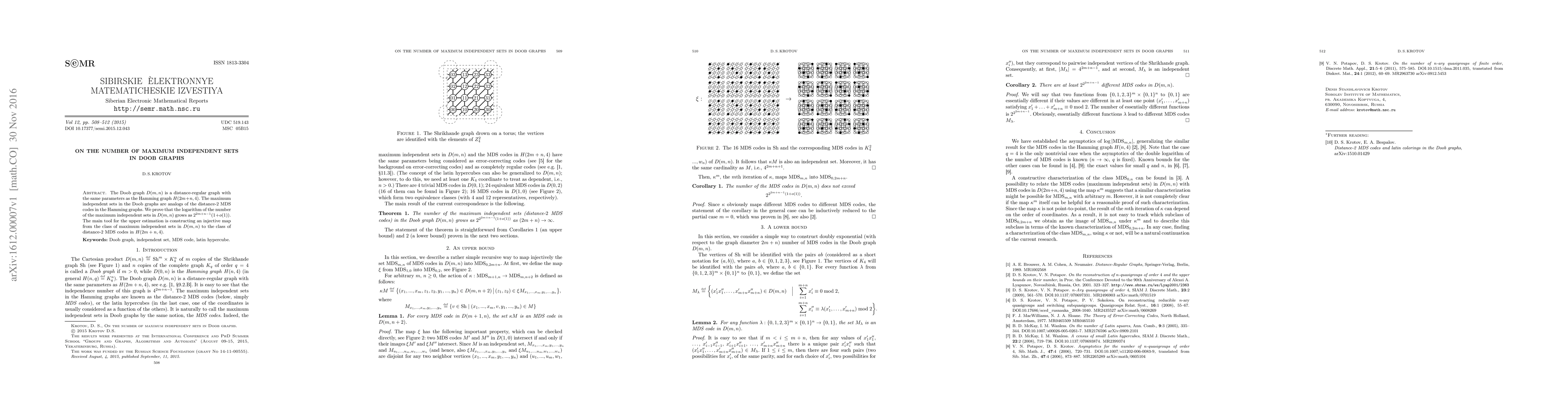 This paper investigates the number of maximum independent sets in Doob graphs $D(m,n)$, showing that their count grows asymptotically as $2^{2m+n-1}(1+o(1))$. The study leverages an injective map linking these sets to distance-$2$ maximum distance separable (MDS) codes in Hamming graphs $H(2m+n,4)$ to derive the result.