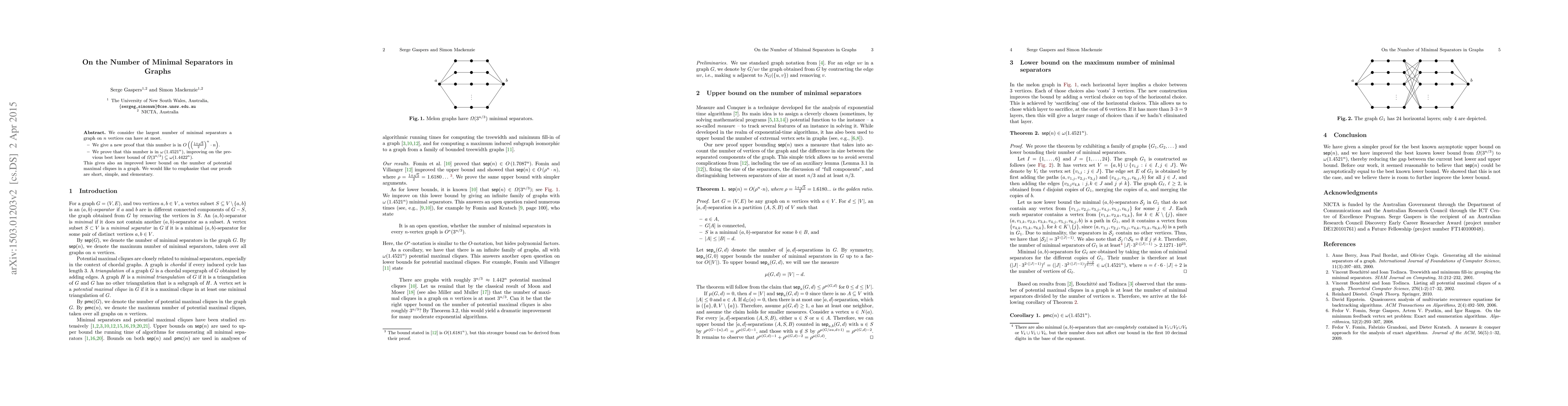 This paper explores the upper and lower bounds for the number of minimal separators in graphs, proving that the upper bound is $O( ((1+\sqrt{5})/2)^n n )$ and the lower bound is $\omega( 1.4521^n )$, improving previous bounds. The proofs are noted for their simplicity and brevity.