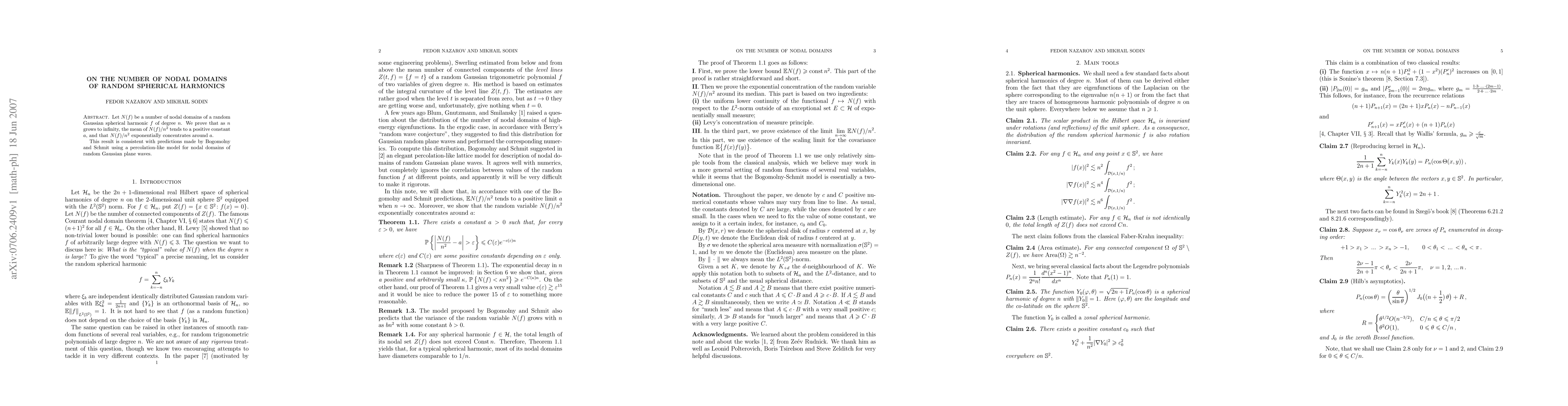 This paper proves that the mean number of nodal domains, N(f), of random Gaussian spherical harmonics of degree n, normalized by n^2, tends to a positive constant as n grows large, and that this ratio exponentially concentrates around that constant, aligning with predictions from a percolation-like model for random Gaussian plane waves.