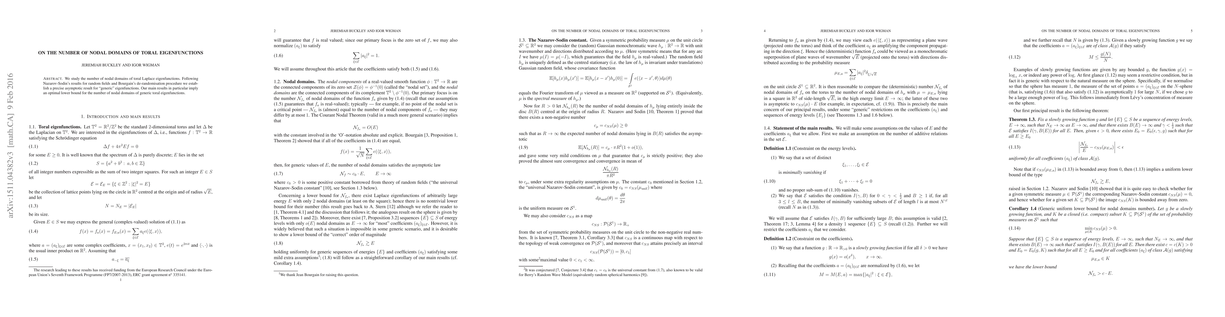 The paper introduces a precise asymptotic formula for the expected number of nodal domains of toral Laplace eigenfunctions, building upon Bourgain's de-randomization technique.