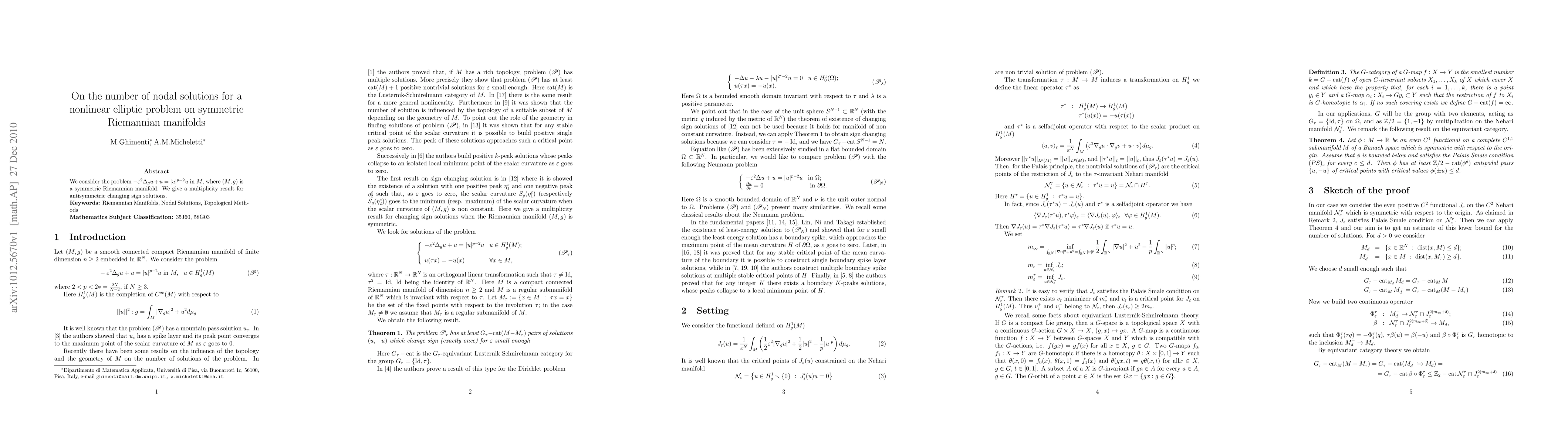 Summary: This paper investigates the existence of nodal solutions for a nonlinear elliptic problem on symmetric Riemannian manifolds, providing a multiplicity result for antisymmetric, changing sign solutions. The study focuses on the parameter ε and the exponent p in the equation.