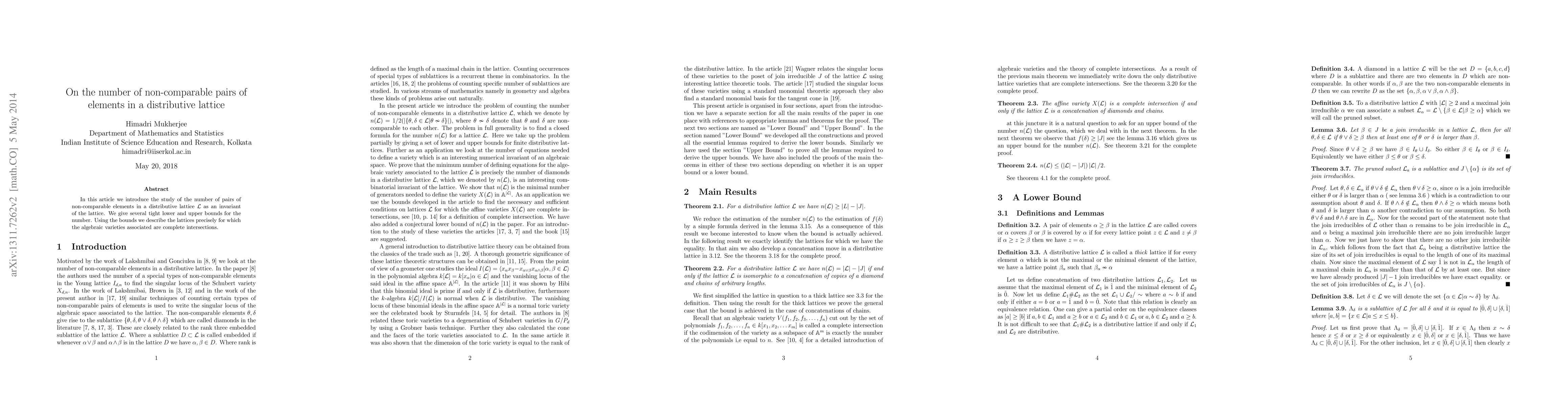 This paper investigates the count of non-comparable pairs in distributive lattices $\L$, providing tight bounds for this count and applying the results to determine which associated algebraic varieties are complete intersections.