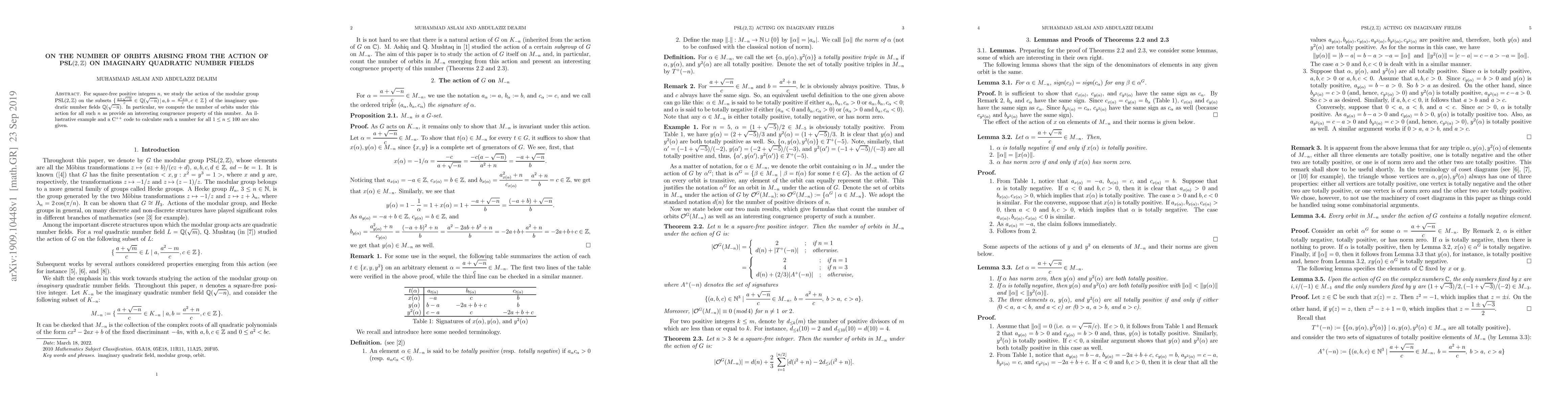 For square-free positive integers $n$, we study the action of the modular group $\mbox{PSL}(2,\mathbb{Z})$ on the subsets $\{\,\frac{a+\sqrt{-n}}{c}\in \mathbb{Q}(\sqrt{-n})\, | \, a,b=\frac{a^2+n}{c},c \in \mathbb{Z} \,\}$ of the imaginary quadratic number fields $\mathbb{Q}(\sqrt{-n})$. In particular, we compute the number of orbits under this action for all such $n$ as provide an interesting congruence property of this number. An illustrative example and a C$^{++}$ code to calculate such a number for all $1\leq n \leq 100$ are also given.