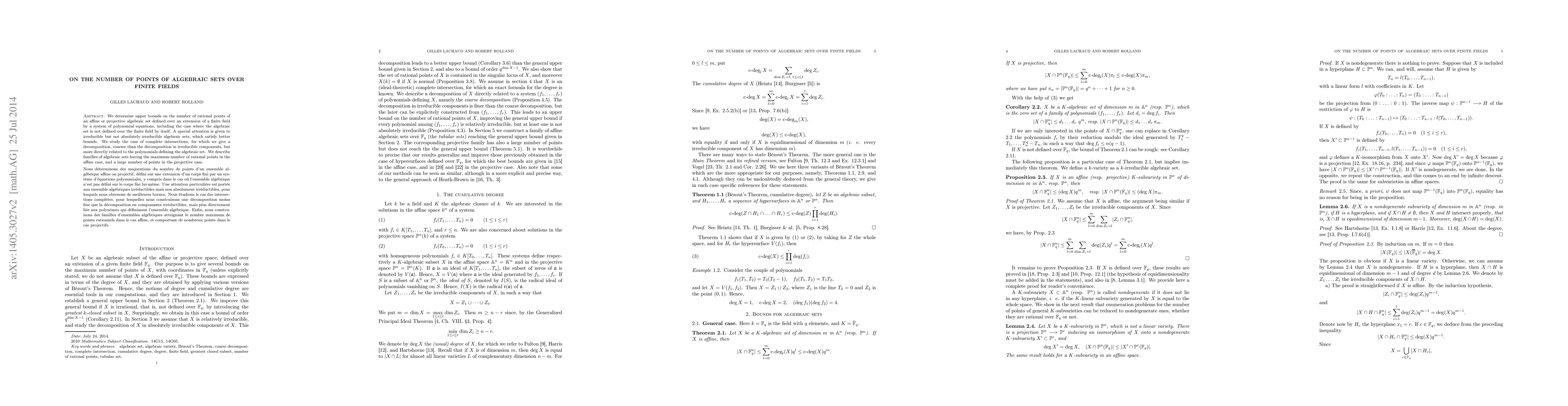 We determine upper bounds on the number of rational points of an affine or projective algebraic set defined over an extension of a finite field by a system of polynomial equations, including the case where the algebraic set is not defined over the finite field by itself. A special attention is given to irreducible but not absolutely irreducible algebraic sets, which satisfy better bounds. We study the case of complete intersections, for which we give a decomposition, coarser than the decomposition in irreducible components, but more directly related to the polynomials defining the algebraic set. We describe families of algebraic sets having the maximum number of rational points in the affine case, and a large number of points in the projective case. Nous d\'eterminons des majorations du nombre de points d'un ensemble alg\'ebrique affine ou projectif, d\'efini sur une extension d'un corps fini par un syst\`eme d'\'equations polynomiales, y compris dans le cas o\`u l'ensemble alg\'ebrique n'est pas d\'efini sur le corps fini lui-m\^eme. Une attention particuli\`ere est port\'ee aux ensemble alg\'ebriques irr\'eductibles mais non absolument irr\'eductibles, pour lesquels nous obtenons de meilleures bornes. Nous \'etudions le cas des intersections compl\`etes, pour lesquelles nous construisons une d\'ecomposition moins fine que la d\'ecomposition en composantes irr\'eductibles, mais plus directement li\'ee aux polyn\^omes qui d\'efinissent l'ensemble alg\'ebrique. Enfin, nous construisons des familles d'ensembles alg\'ebriques atteignant le nombre maximum de points rationnels dans le cas affine, et comportant de nombreux points dans le cas projectifs.