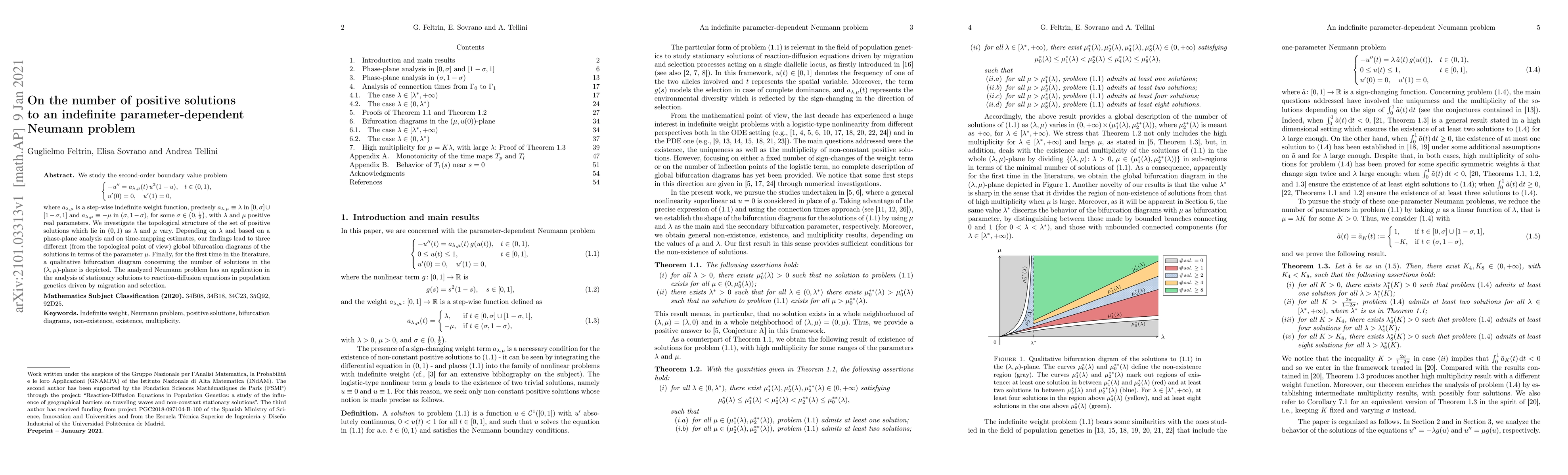 We study the second-order boundary value problem \begin{equation*} \begin{cases} \, -u''=a_{\lambda,\mu}(t) \, u^{2}(1-u), & t\in(0,1), \\ \, u'(0)=0, \quad u'(1)=0, \end{cases} \end{equation*} where $a_{\lambda,\mu}$ is a step-wise indefinite weight function, precisely $a_{\lambda,\mu}\equiv\lambda$ in $[0,\sigma]\cup[1-\sigma,1]$ and $a_{\lambda,\mu}\equiv-\mu$ in $(\sigma,1-\sigma)$, for some $\sigma\in\left(0,\frac{1}{2}\right)$, with $\lambda$ and $\mu$ positive real parameters. We investigate the topological structure of the set of positive solutions which lie in $(0,1)$ as $\lambda$ and $\mu$ vary. Depending on $\lambda$ and based on a phase-plane analysis and on time-mapping estimates, our findings lead to three different (from the topological point of view) global bifurcation diagrams of the solutions in terms of the parameter $\mu$. Finally, for the first time in the literature, a qualitative bifurcation diagram concerning the number of solutions in the $(\lambda,\mu)$-plane is depicted. The analyzed Neumann problem has an application in the analysis of stationary solutions to reaction-diffusion equations in population genetics driven by migration and selection.