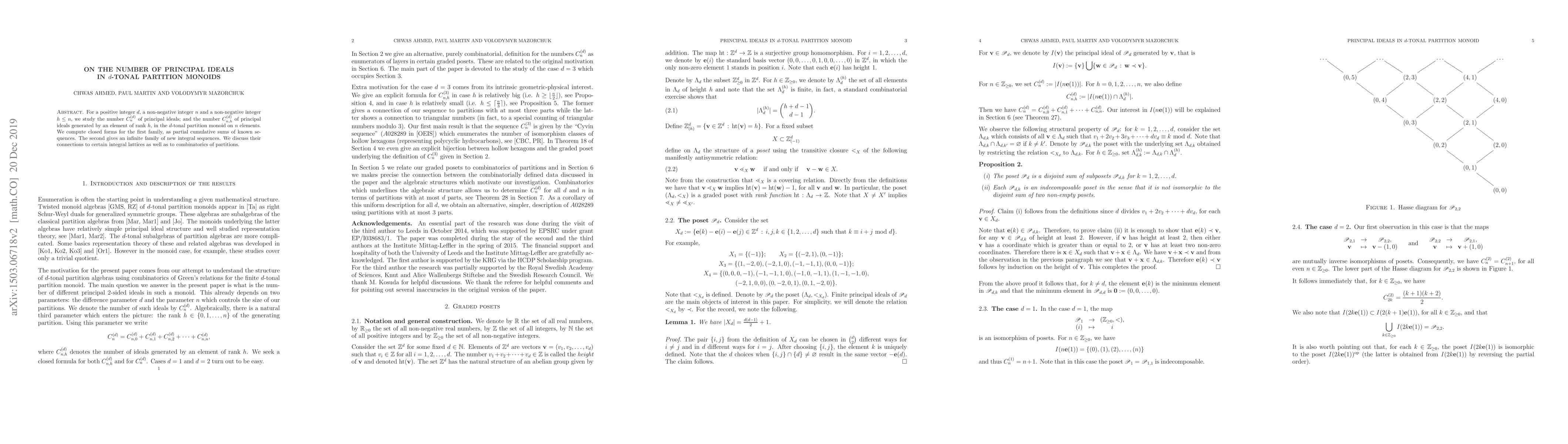 For a positive integer $d$, a non-negative integer $n$ and a non-negative integer $h\leq n$, we study the number $C_{n}^{(d)}$ of principal ideals; and the number $C_{n,h}^{(d)}$ of principal ideals generated by an element of rank $h$, in the $d$-tonal partition monoid on $n$ elements. We compute closed forms for the first family, as partial cumulative sums of known sequences. The second gives an infinite family of new integral sequences. We discuss their connections to certain integral lattices as well as to combinatorics of partitions.