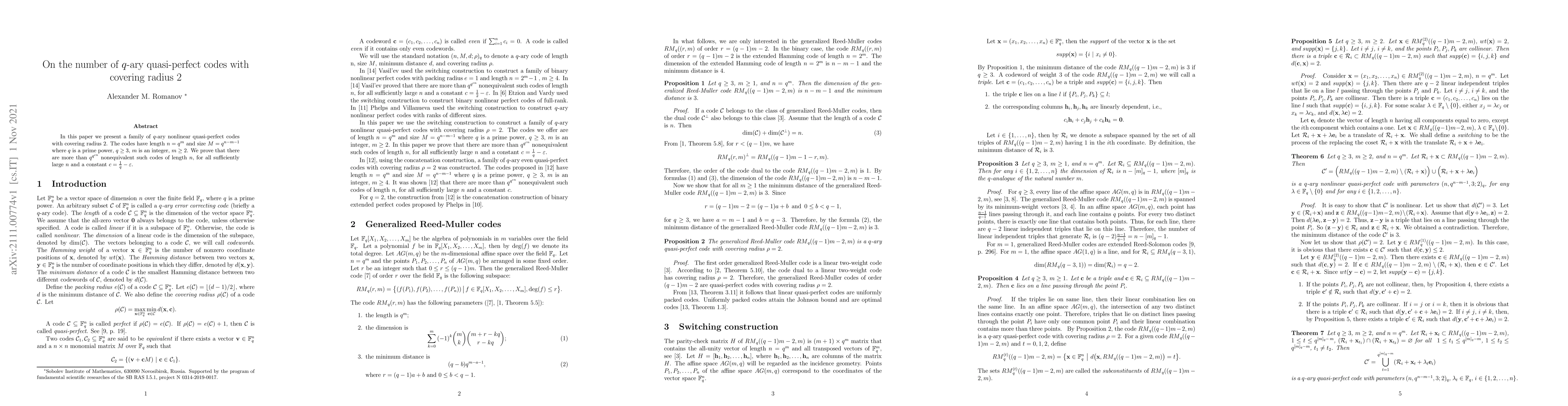 In this paper we present a family of $q$-ary nonlinear quasi-perfect codes with covering radius 2. The codes have length $n = q^m$ and size $ M = q^{n - m - 1}$ where $q$ is a prime power, $q \geq 3$, $m$ is an integer, $m \geq 2$. We prove that there are more than $q^{q^{cn}}$ nonequivalent such codes of length $n$, for all sufficiently large $n$ and a constant $c = \frac{1}{q} - \varepsilon$.