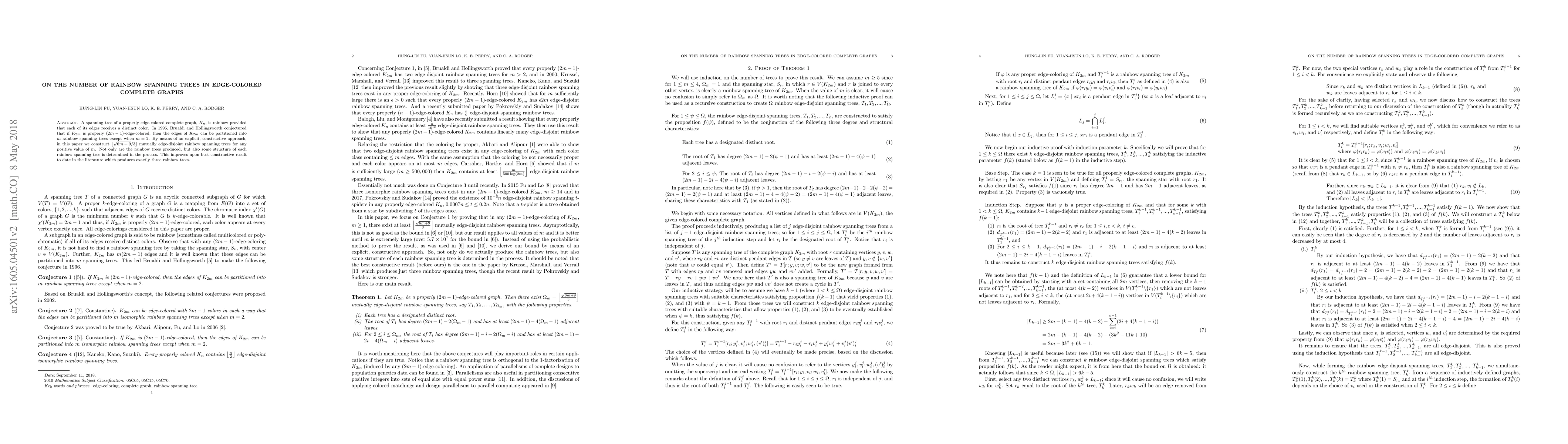 A spanning tree of a properly edge-colored complete graph, $K_n$, is rainbow provided that each of its edges receives a distinct color. In 1996, Brualdi and Hollingsworth conjectured that if $K_{2m}$ is properly $(2m-1)$-edge-colored, then the edges of $K_{2m}$ can be partitioned into $m$ rainbow spanning trees except when $m=2$. By means of an explicit, constructive approach, in this paper we construct $\lfloor \sqrt{6m+9}/3 \rfloor$ mutually edge-disjoint rainbow spanning trees for any positive value of $m$. Not only are the rainbow trees produced, but also some structure of each rainbow spanning tree is determined in the process. This improves upon best constructive result to date in the literature which produces exactly three rainbow trees.