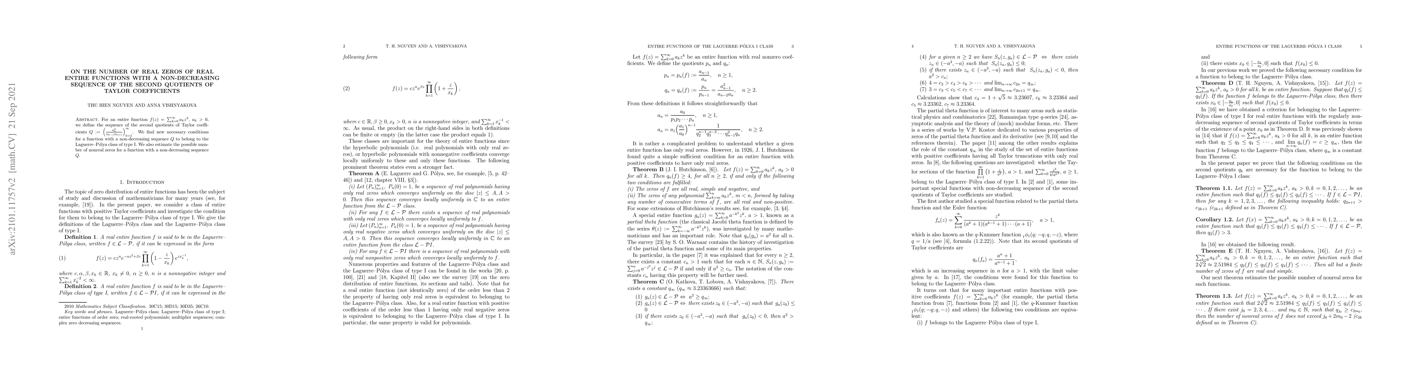 For an entire function $f(z) = \sum_{k=0}^\infty a_k z^k,$ $a_k >0,$ we define the sequence of the second quotients of Taylor coefficients $Q := \left( \frac{a_k^2}{a_{k-1}a_{k+1}} \right)_{k=1}^\infty$. We find new necessary conditions for a function with a non-decreasing sequence $Q$ to belong to the Laguerre--P\'olya class of type I. We also estimate the possible number of nonreal zeros for a function with a non-decreasing sequence $Q.$