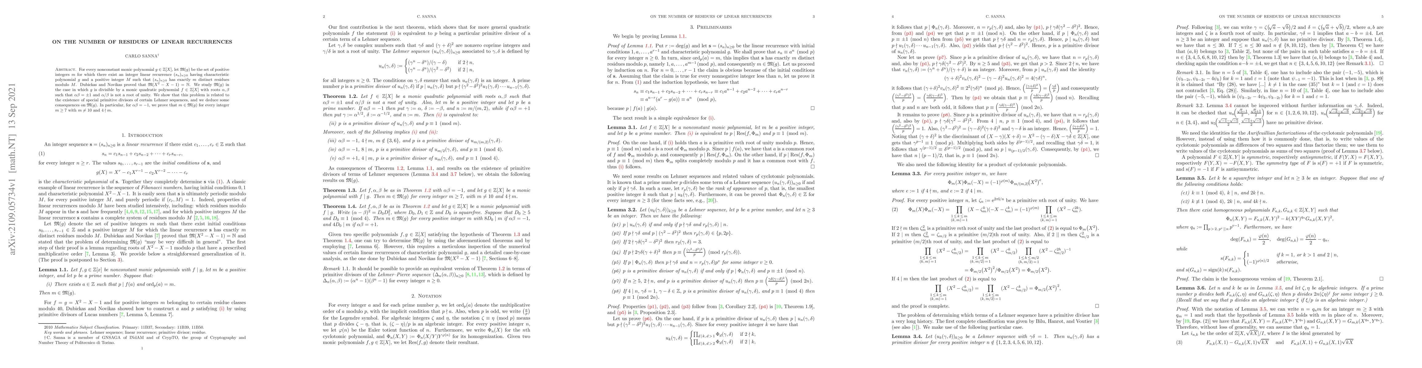 For every nonconstant monic polynomial $g \in \mathbb{Z}[X]$, let $\mathfrak{M}(g)$ be the set of positive integers $m$ for which there exist an integer linear recurrence $(s_n)_{n \geq 0}$ having characteristic polynomial $g$ and a positive integer $M$ such that $(s_n)_{n \geq 0}$ has exactly $m$ distinct residues modulo $M$. Dubickas and Novikas proved that $\mathfrak{M}(X^2 - X - 1) = \mathbb{N}$. We study $\mathfrak{M}(g)$ in the case in which $g$ is divisible by a monic quadratic polynomial $f \in \mathbb{Z}[X]$ with roots $\alpha,\beta$ such that $\alpha\beta = \pm 1$ and $\alpha / \beta$ is not a root of unity. We show that this problem is related to the existence of special primitive divisors of certain Lehmer sequences, and we deduce some consequences on $\mathfrak{M}(g)$. In particular, for $\alpha\beta = -1$, we prove that $m \in \mathfrak{M}(g)$ for every integer $m \geq 7$ with $m \neq 10$ and $4 \nmid m$.