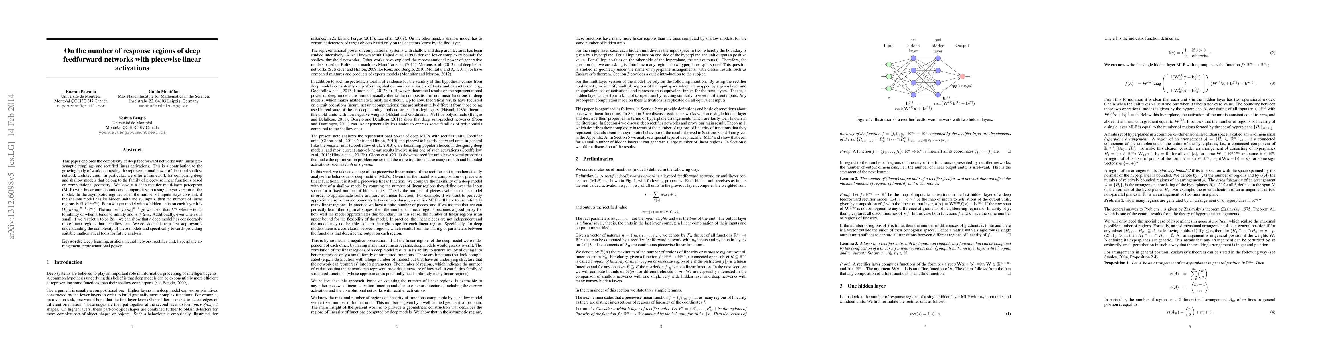 This paper explores the complexity of deep feedforward networks with linear pre-synaptic couplings and rectified linear activations. This is a contribution to the growing body of work contrasting the representational power of deep and shallow network architectures. In particular, we offer a framework for comparing deep and shallow models that belong to the family of piecewise linear functions based on computational geometry. We look at a deep rectifier multi-layer perceptron (MLP) with linear outputs units and compare it with a single layer version of the model. In the asymptotic regime, when the number of inputs stays constant, if the shallow model has $kn$ hidden units and $n_0$ inputs, then the number of linear regions is $O(k^{n_0}n^{n_0})$. For a $k$ layer model with $n$ hidden units on each layer it is $\Omega(\left\lfloor {n}/{n_0}\right\rfloor^{k-1}n^{n_0})$. The number $\left\lfloor{n}/{n_0}\right\rfloor^{k-1}$ grows faster than $k^{n_0}$ when $n$ tends to infinity or when $k$ tends to infinity and $n \geq 2n_0$. Additionally, even when $k$ is small, if we restrict $n$ to be $2n_0$, we can show that a deep model has considerably more linear regions that a shallow one. We consider this as a first step towards understanding the complexity of these models and specifically towards providing suitable mathematical tools for future analysis.