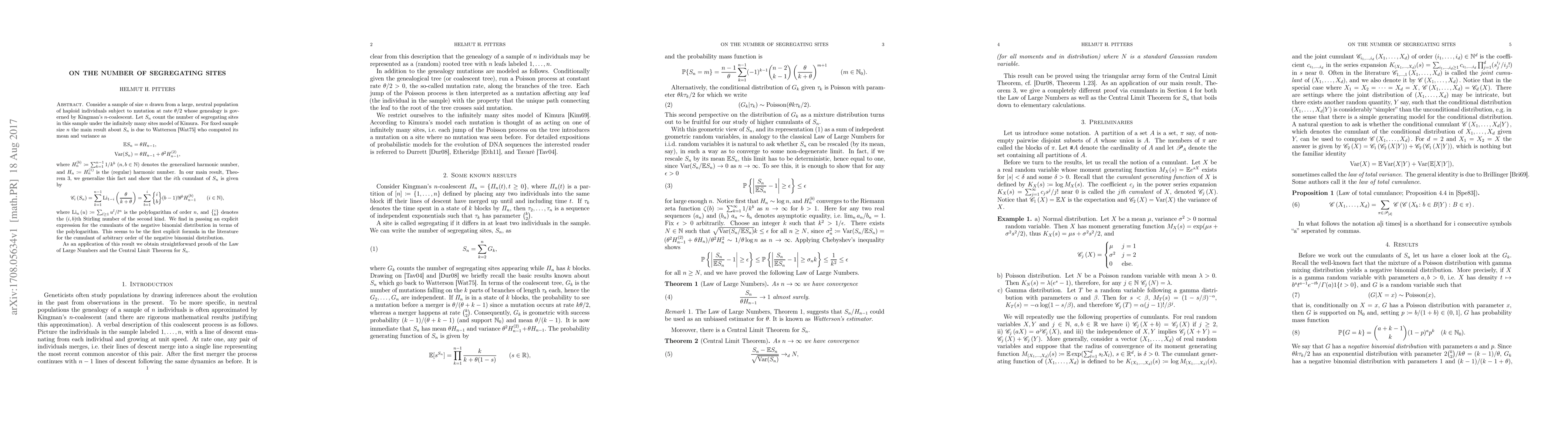 This paper computes the ith cumulant of the number of segregating sites in a sample from a neutral population, generalizing a previous result and providing an explicit formula for arbitrary order, with applications to proving the Law of Large Numbers and Central Limit Theorem.