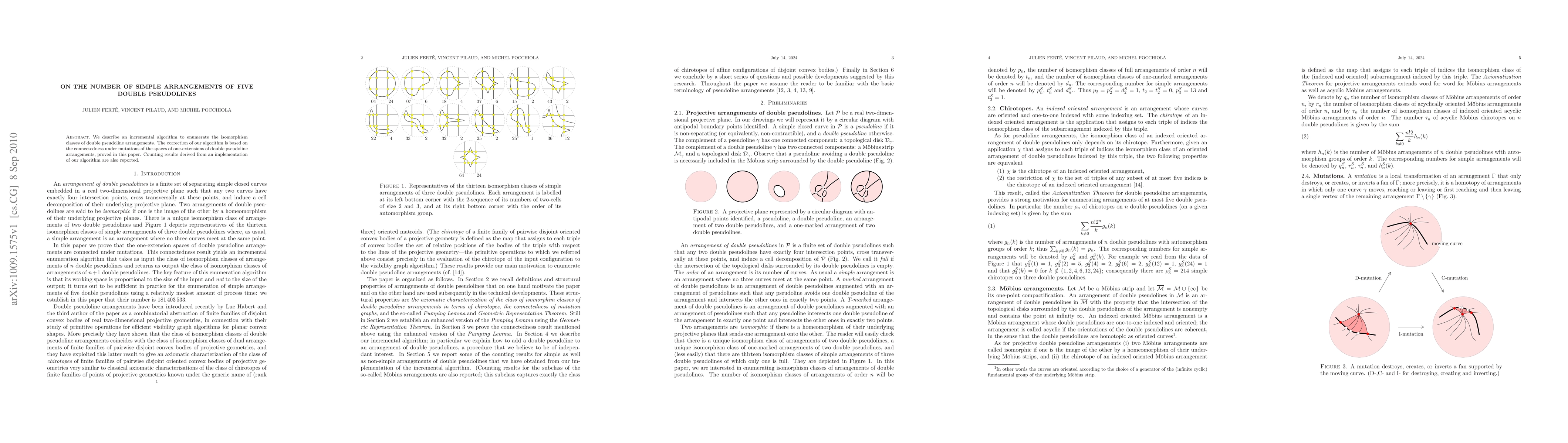We describe an incremental algorithm to enumerate the isomorphism classes of double pseudoline arrangements. The correction of our algorithm is based on the connectedness under mutations of the spaces of one-extensions of double pseudoline arrangements, proved in this paper. Counting results derived from an implementation of our algorithm are also reported.