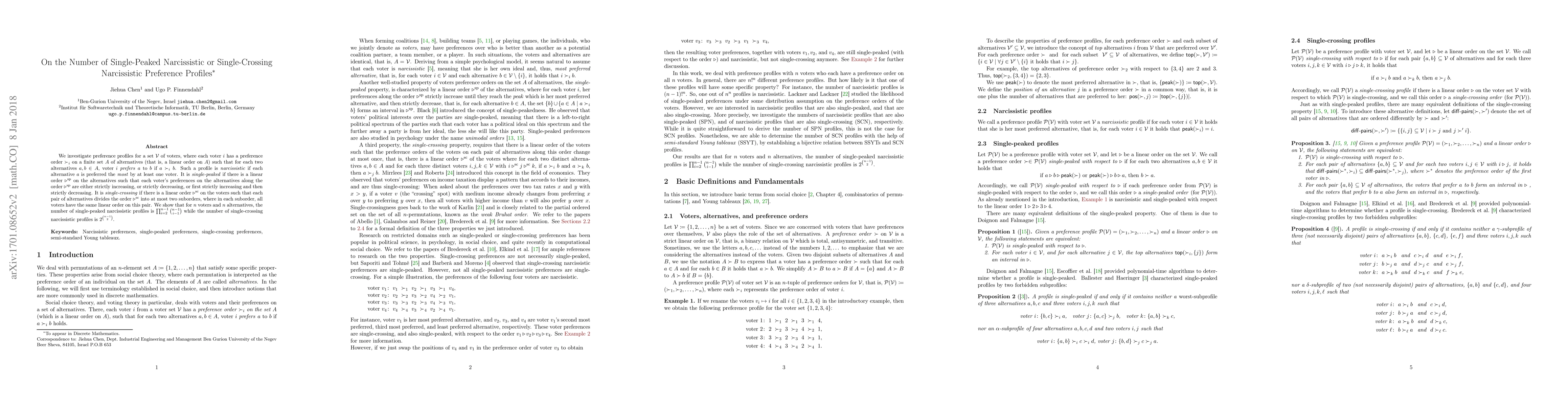 This paper examines preference profiles where each voter has a linear order on alternatives, termed narcissistic if each alternative is most preferred by at least one voter. It finds that for $n$ voters and $n$ alternatives, the number of single-peaked narcissistic profiles is $\prod_{i=2}^{n-1} \binom{n-1}{i-1}$, and the number of single-crossing narcissistic profiles is $2^{\binom{n-1}{2}}$.