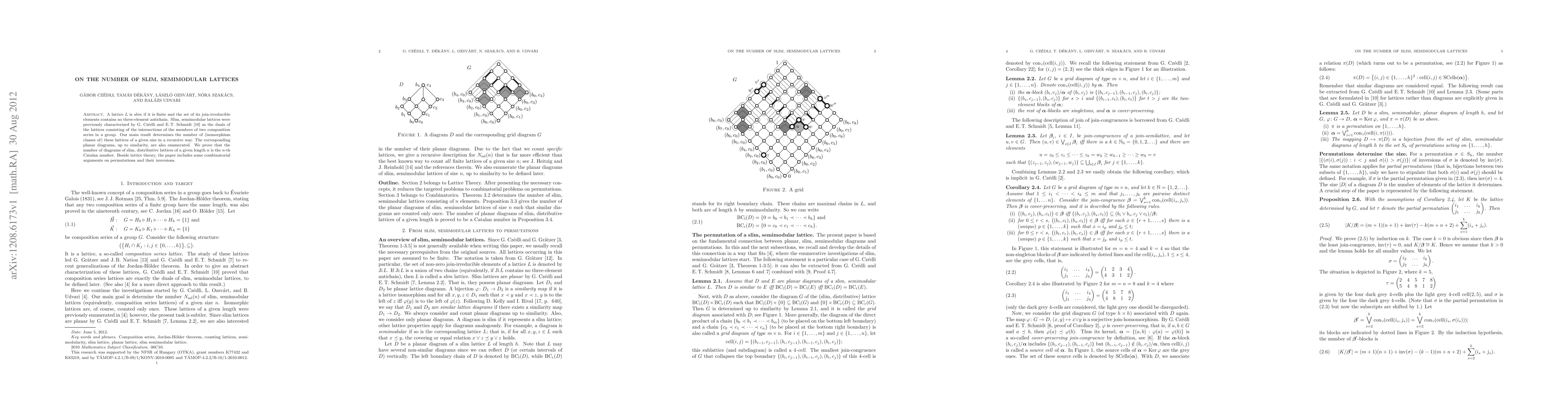 This paper characterizes slim, semimodular lattices as duals of lattices formed by intersections of group composition series intersections, and recursively determines the number of such lattices of a given size. It also enumerates corresponding planar diagrams and shows the number of slim, distributive lattices relates to the n-th Catalan number, incorporating combinatorial arguments on permutations and inversions.