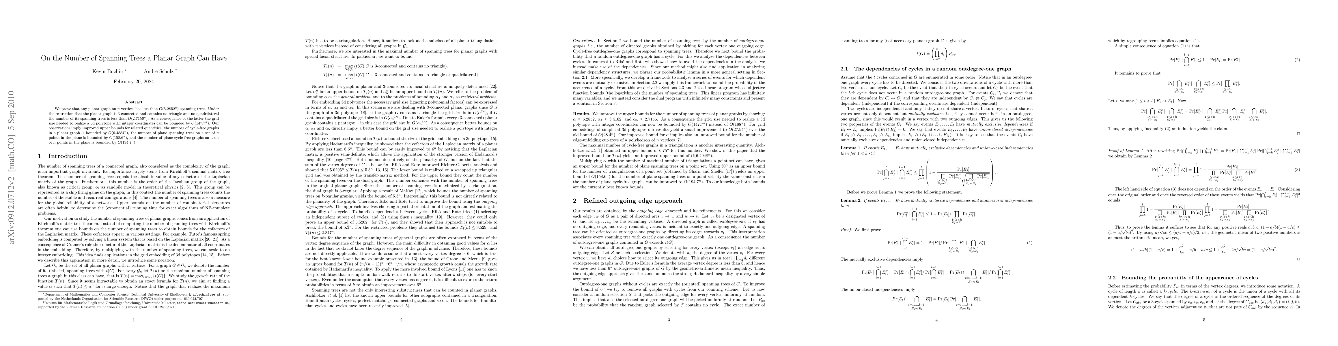 We prove that any planar graph on $n$ vertices has less than $O(5{.}2852^n)$ spanning trees. Under the restriction that the planar graph is 3-connected and contains no triangle and no quadrilateral the number of its spanning trees is less than $O(2{.}7156^n)$. As a consequence of the latter the grid size needed to realize a 3d polytope with integer coordinates can be bounded by $O(147.{7}^n)$. Our observations imply improved upper bounds for related quantities: the number of cycle-free graphs in a planar graph is bounded by $O(6.4884^n)$, the number of plane spanning trees on a set of $n$ points in the plane is bounded by $O(158.6^n)$, and the number of plane cycle-free graphs on a set of $n$ points in the plane is bounded by $O(194{.}7^n)$.