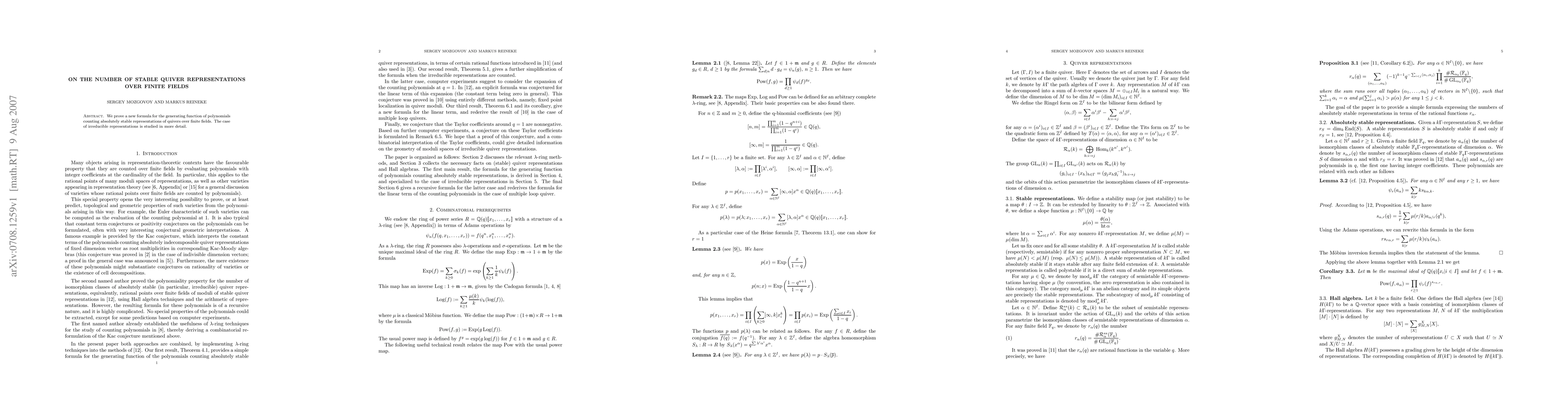 Summary: This paper presents a novel formula for the generating function of polynomials that count absolutely stable quiver representations over finite fields, with a particular focus on the irreducible representations.