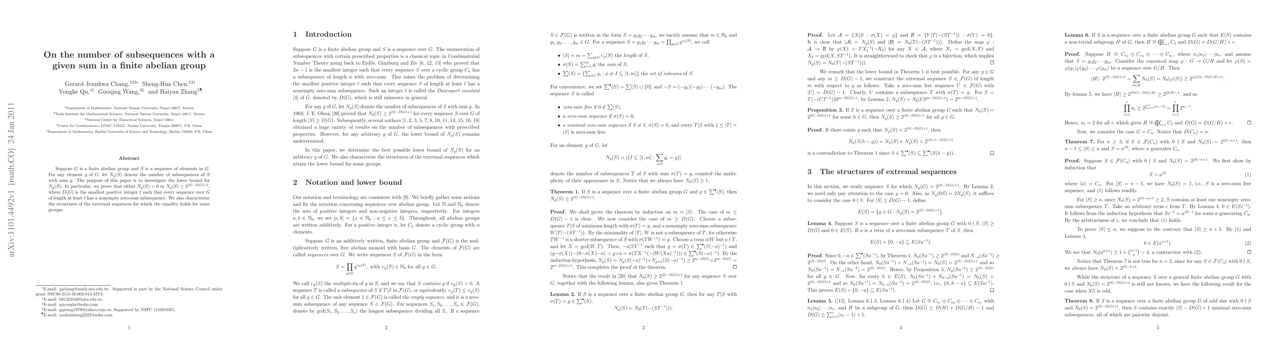 This paper investigates the minimum count (N_g(S)) of subsequences in a finite abelian group G summing to a given element g. It proves that N_g(S) is either zero or at least 2^(|S|-D(G)+1), where D(G) is the shortest sequence length in G without a zero-sum subsequence. The research also identifies the structural characteristics of sequences achieving this minimum for certain groups.