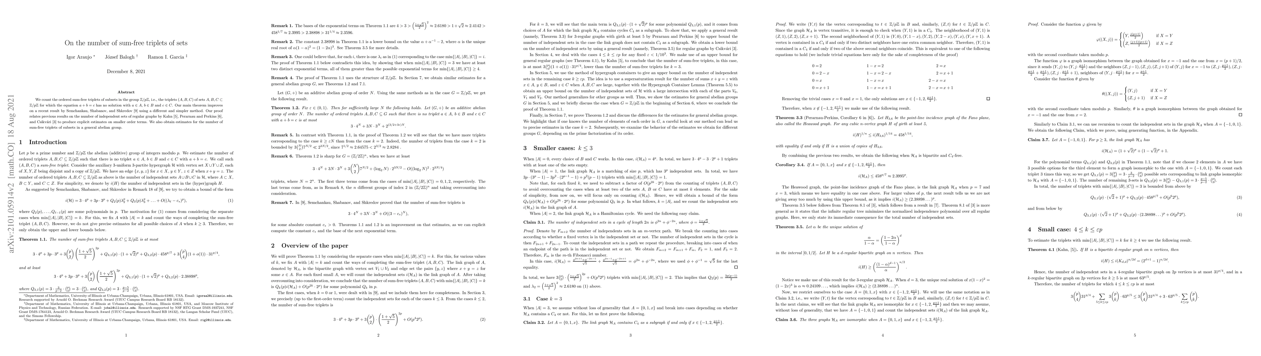 This paper counts ordered sum-free triplets of subsets in the group $\mathbb{Z}/p\mathbb{Z}$, where $a+b=c$ has no solutions with $a\in A$, $b \in B$, and $c \in C$. The authors improve upon a previous result using a simpler method and relate it to findings on independent sets in regular graphs to provide explicit estimates.