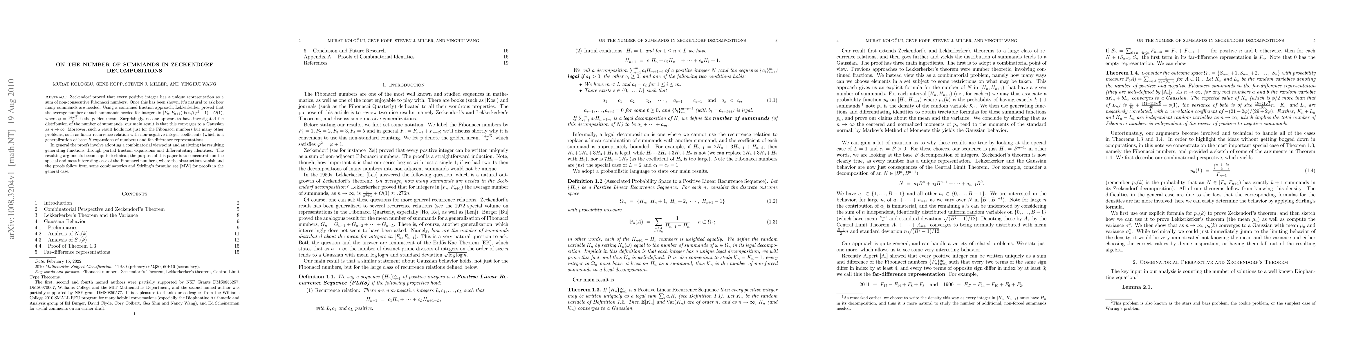 This paper investigates the number of summands in Zeckendorf decompositions, which represent positive integers as sums of non-consecutive Fibonacci numbers. It finds that the distribution of summands converges to a Gaussian as the integer size approaches infinity, and this result extends beyond Fibonacci numbers to other linear recurrence relations.