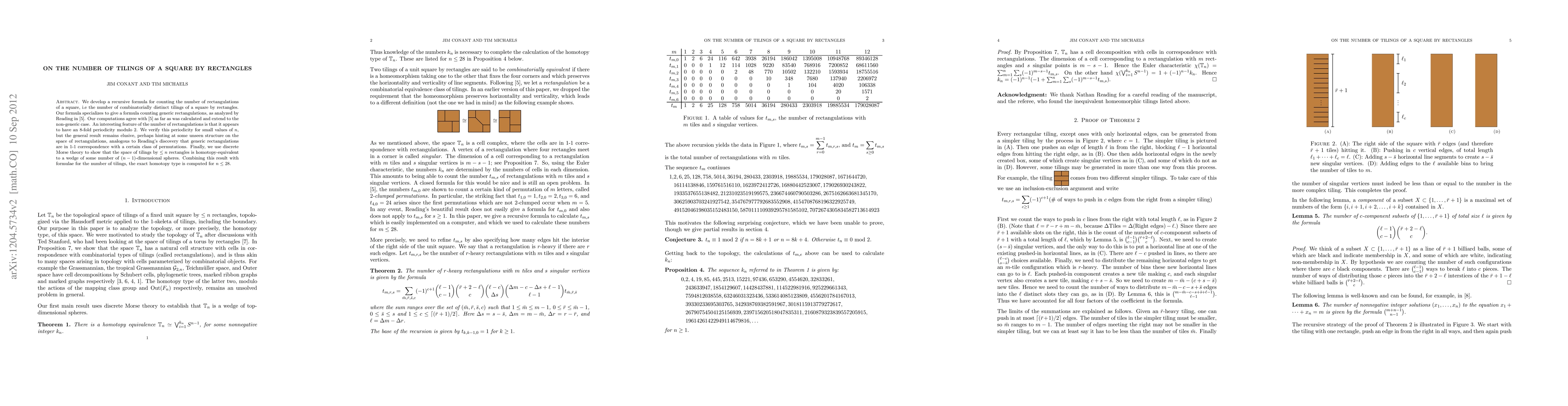This paper presents a recursive formula for counting square tilings by rectangles, extending previous work to non-generic cases. It reveals an intriguing 8-fold periodicity modulo 2 in the number of tilings, verified for small n, and uses discrete Morse theory to determine the homotopy type of the tiling space for n≤28.
