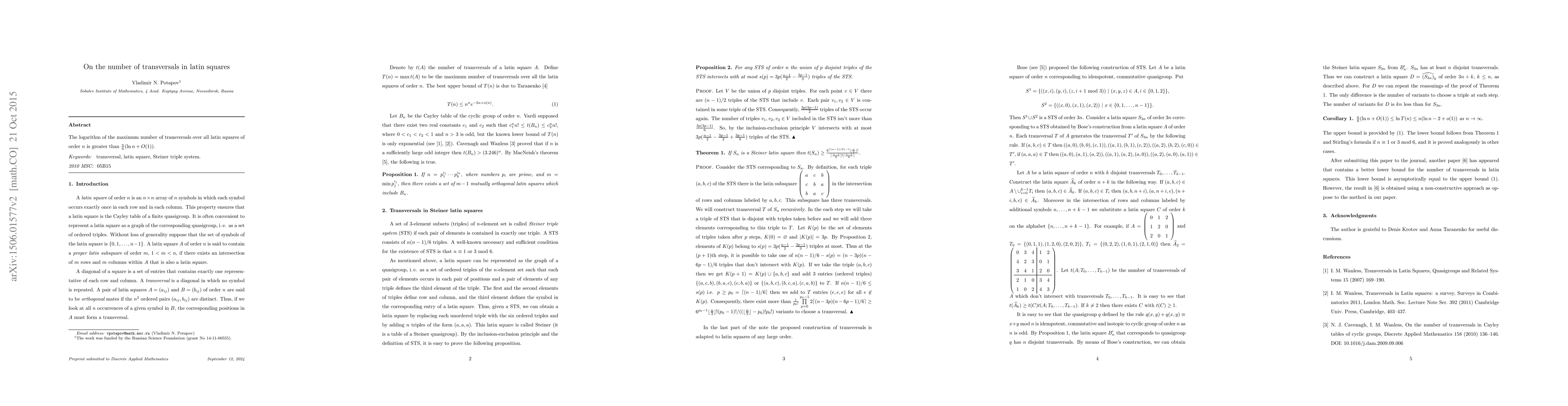 The logarithm of the maximum number of transversals over all latin squares of order $n$ is greater than $\frac{n}{6}(\ln n+ O(1))$.