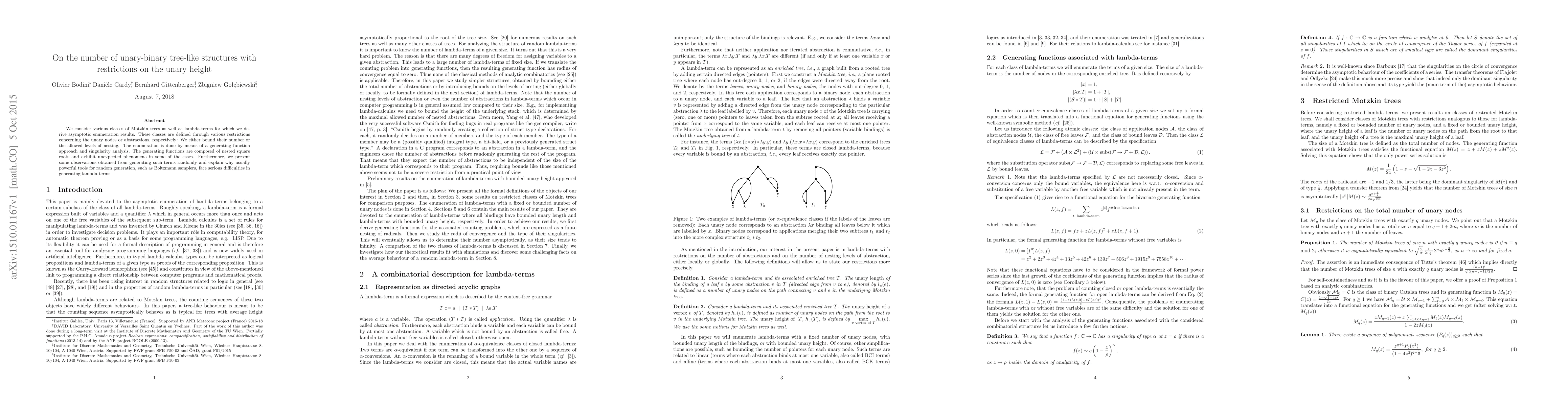 We consider various classes of Motzkin trees as well as lambda-terms for which we derive asymptotic enumeration results. These classes are defined through various restrictions concerning the unary nodes or abstractions, respectively: We either bound their number or the allowed levels of nesting. The enumeration is done by means of a generating function approach and singularity analysis. The generating functions are composed of nested square roots and exhibit unexpected phenomena in some of the cases. Furthermore, we present some observations obtained from generating such terms randomly and explain why usually powerful tools for random generation, such as Boltzmann samplers, face serious difficulties in generating lambda-terms.