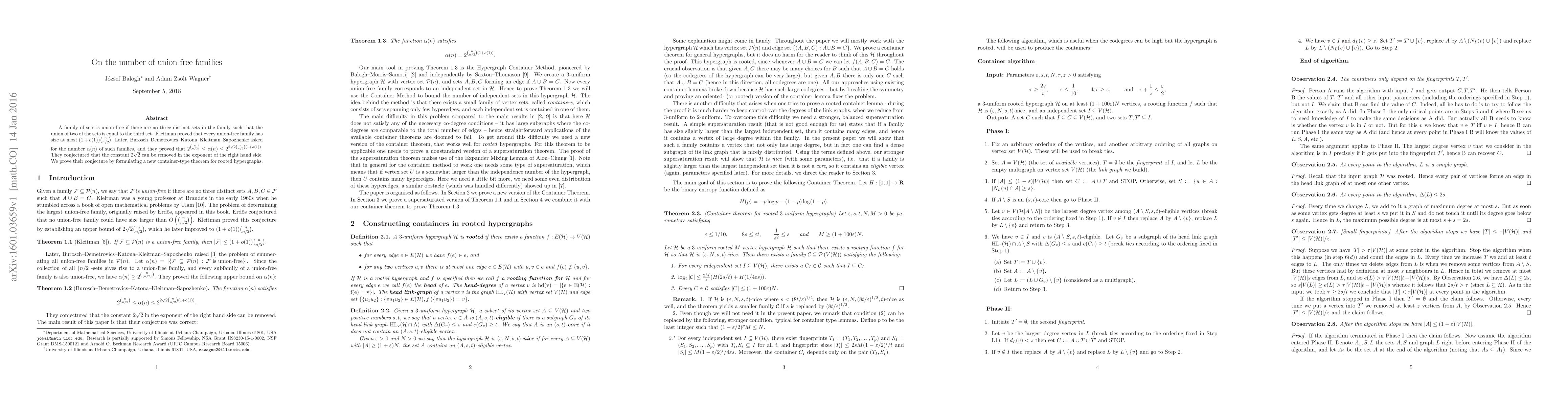 This paper proves that the number of union-free families of sets, denoted as $\alpha(n)$, satisfies $\alpha(n) \leq 2^{\binom{n}{n/2}(1+o(1))}$, resolving a conjecture by Kleitman and others that the constant $2\sqrt{2}$ in the upper bound could be removed. The proof utilizes a new container-type theorem for rooted hypergraphs.