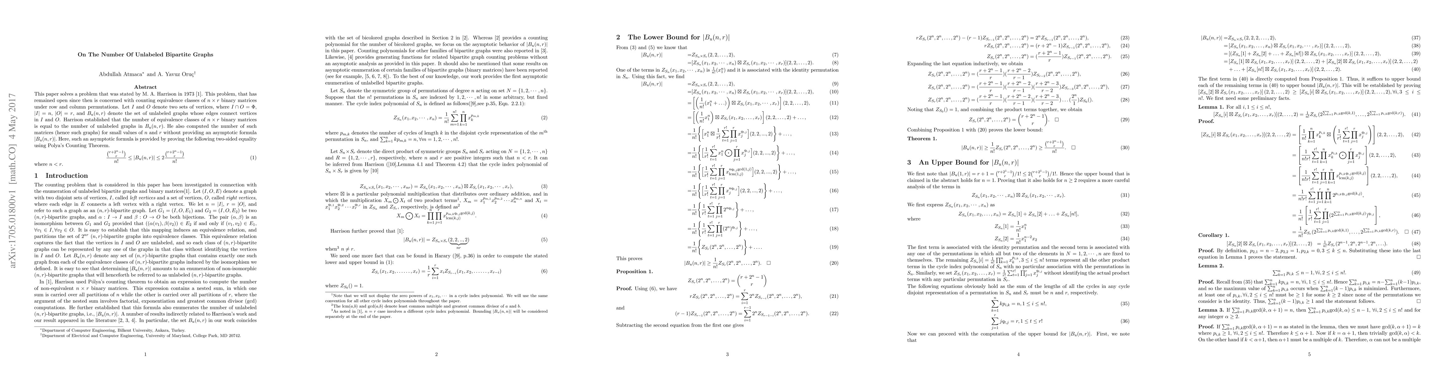This paper solves a problem that was stated by M. A. Harrison in 1973~\cite{harrison1973number}. This problem, that has remained open since then is concerned with counting equivalence classes of $n\times r$ binary matrices under row and column permutations. Let $I$ and $O$ denote two sets of vertices, where $I\cap O =\Phi$, $|I| = n$, $|O| = r$, and $B_u(n,r)$ denote the set of unlabeled graphs whose edges connect vertices in $I$ and $O$. Harrison established that the number of equivalence classes of $n\times r$ binary matrices is equal to the number of unlabeled graphs in $B_u(n,r).$ He also computed the number of such matrices (hence such graphs) for small values of $n$ and $r$ without providing an asymptotic formula $|B_u(n,r)|.$ Here, such an asymptotic formula is provided by proving the following two-sided equality using Polya's Counting Theorem.