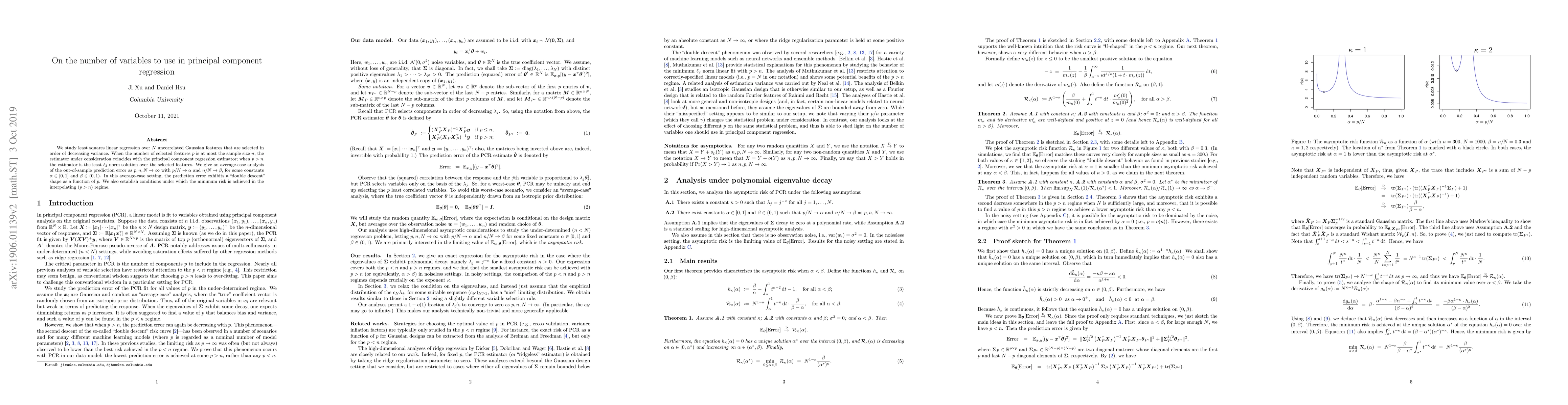 This paper investigates the performance of principal component regression in high-dimensional settings, showing that the prediction error exhibits a "double descent" shape as the number of selected features increases. It establishes conditions for achieving minimum risk when the number of features exceeds the sample size.