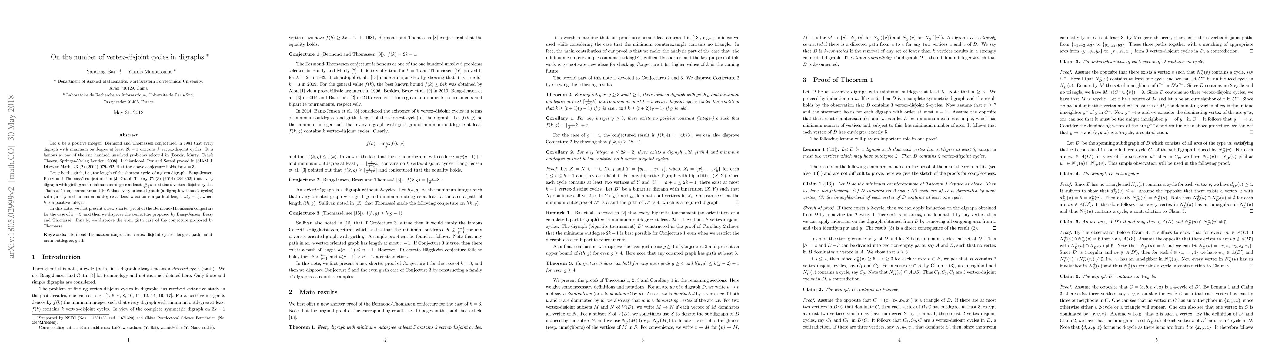 Let $k$ be a positive integer. Bermond and Thomassen conjectured in 1981 that every digraph with minimum outdegree at least $2k-1$ contains $k$ vertex-disjoint cycles. It is famous as one of the one hundred unsolved problems selected in [Bondy, Murty, Graph Theory, Springer-Verlag London, 2008]. Lichiardopol, Por and Sereni proved in [SIAM J. Discrete Math. 23 (2) (2009) 979-992] that the above conjecture holds for $k=3$. Let $g$ be the girth, i.e., the length of the shortest cycle, of a given digraph. Bang-Jensen, Bessy and Thomass\'{e} conjectured in [J. Graph Theory 75 (3) (2014) 284-302] that every digraph with girth $g$ and minimum outdegree at least $\frac{g}{g-1}k$ contains $k$ vertex-disjoint cycles. Thomass\'{e} conjectured around 2005 that every oriented graph (a digraph without 2-cycles) with girth $g$ and minimum outdegree at least $h$ contains a path of length $h(g-1)$, where $h$ is a positive integer. In this note, we first present a new shorter proof of the Bermond-Thomassen conjecture for the case of $k=3$, and then we disprove the conjecture proposed by Bang-Jensen, Bessy and Thomass\'{e}. Finally, we disprove the even girth case of the conjecture proposed by Thomass\'{e}.