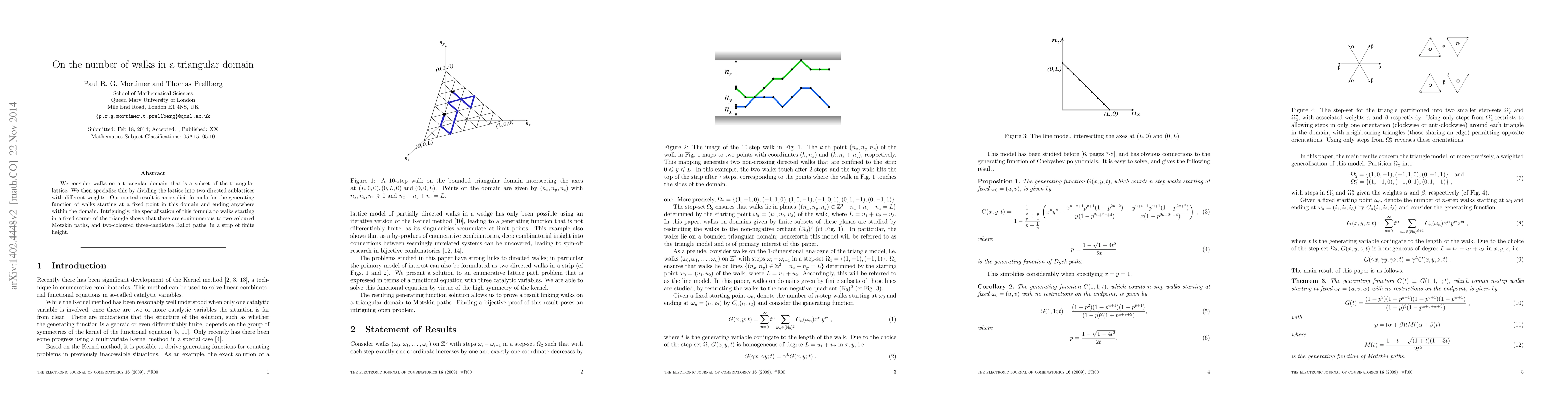 We consider walks on a triangular domain that is a subset of the triangular lattice. We then specialise this by dividing the lattice into two directed sublattices with different weights. Our central result is an explicit formula for the generating function of walks starting at a fixed point in this domain and ending anywhere within the domain. Intriguingly, the specialisation of this formula to walks starting in a fixed corner of the triangle shows that these are equinumerous to two-coloured Motzkin paths, and two-coloured three-candidate Ballot paths, in a strip of finite height.