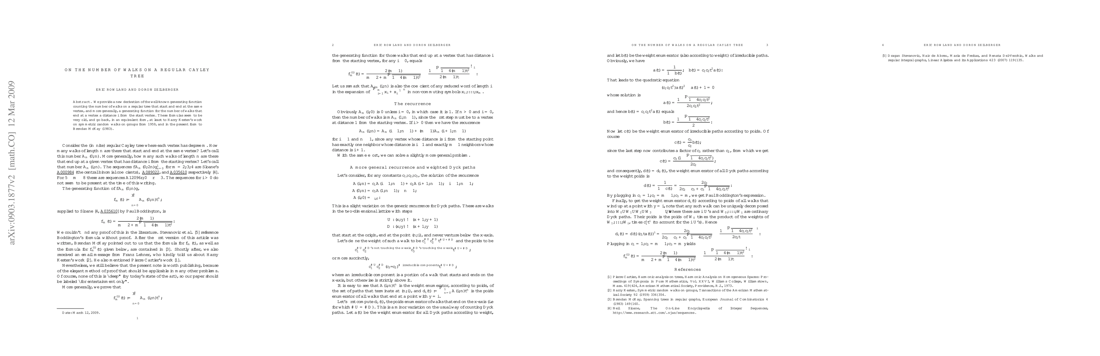 We provide a new derivation of the well-known generating function counting the number of walks on a regular tree that start and end at the same vertex, and more generally, a generating function for the number of walks that end at a vertex a distance i from the start vertex. These formulas seem to be very old, and go back, in an equivalent form, at least to Harry Kesten's work on symmetric random walks on groups from 1959, and in the present form to Brendan McKay (1983).