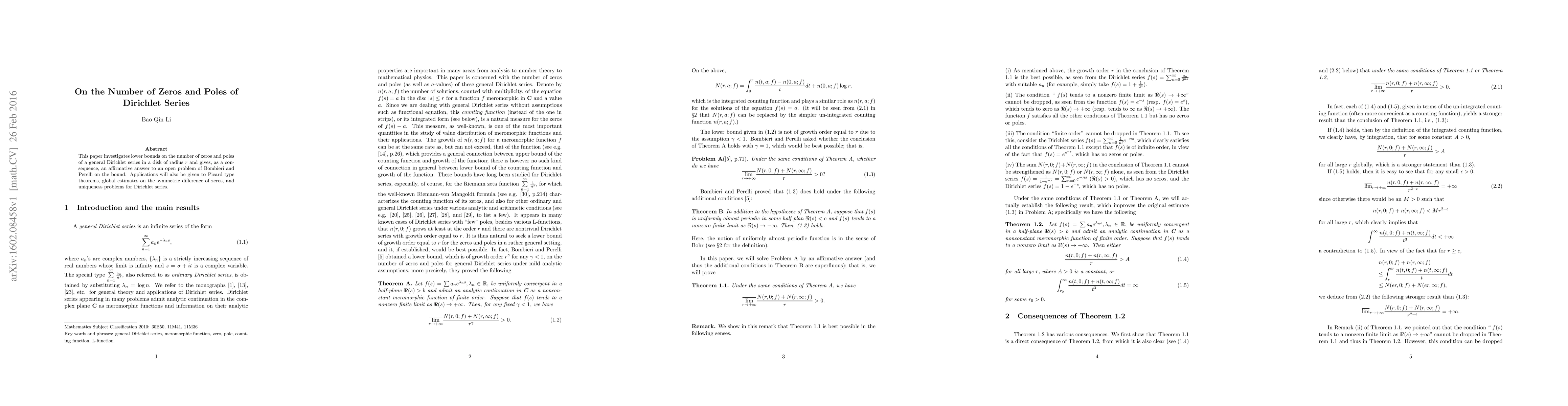 This paper investigates lower bounds on the number of zeros and poles of a general Dirichlet series in a disk of radius $r$ and gives, as a consequence, an affirmative answer to an open problem of Bombieri and Perelli on the bound. Applications will also be given to Picard type theorems, global estimates on the symmetric difference of zeros, and uniqueness problems for Dirichlet series.
