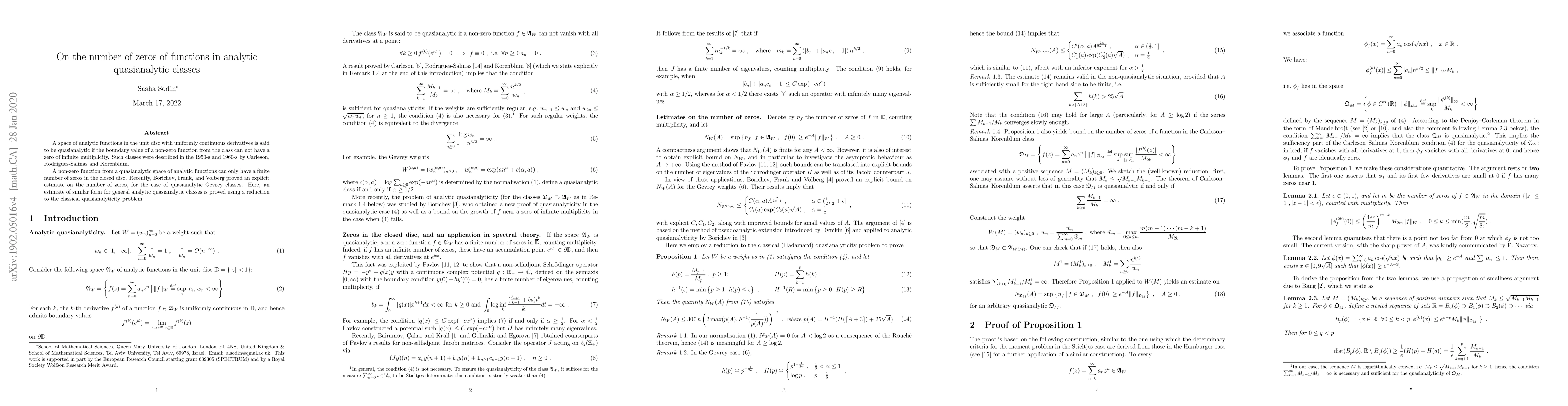 A space of analytic functions in the unit disc with uniformly continuous derivatives is said to be quasianalytic if the boundary value of a non-zero function from the class can not have a zero of infinite multiplicity. Such classes were described in the 1950-s and 1960-s by Carleson, Rodrigues-Salinas and Korenblum. A non-zero function from a quasianalytic space of analytic functions can only have a finite number of zeros in the closed disc. Recently, Borichev, Frank, and Volberg proved an explicit estimate on the number of zeros, for the case of quasianalytic Gevrey classes. Here, an estimate of similar form for general analytic quasianalytic classes is proved using a reduction to the classical quasianalyticity problem.