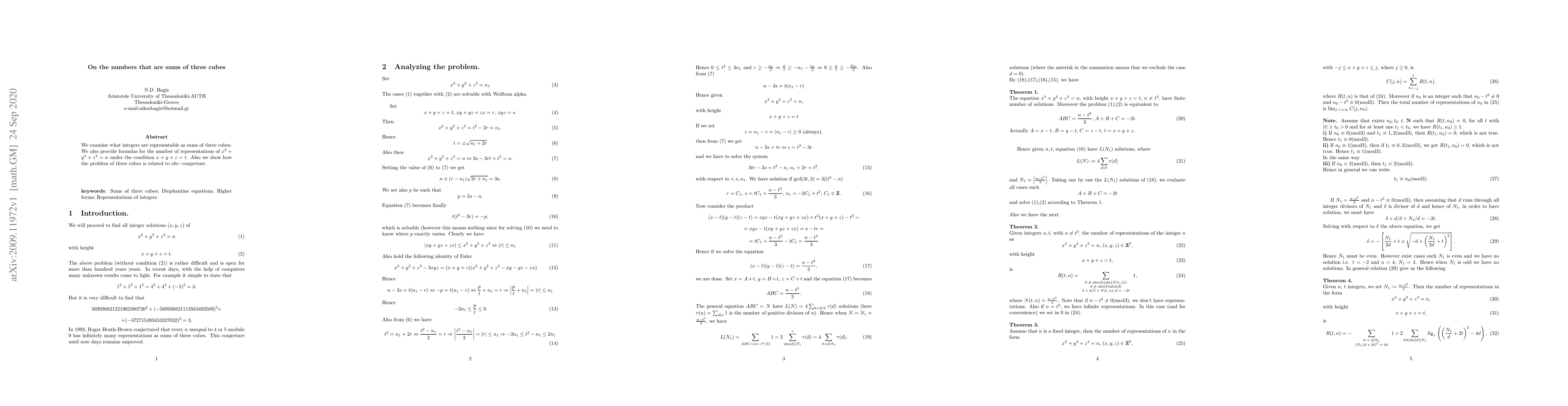 We examine what integers are representable as sums of three cubes. We also provide formulas for the number of representations of $x^3+y^3+z^3=n$ under the condition $x+y+z=t$. Also we show how the problem of three cubes is related to $abc-$conjecture.