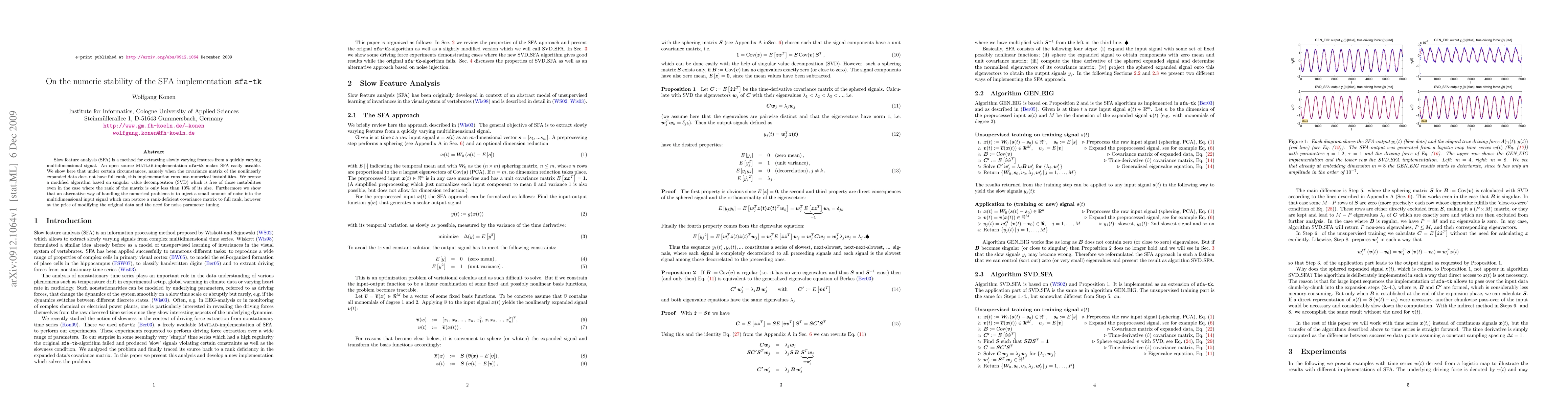 This paper investigates the numeric stability of the SFA implementation sfa-tk, identifying instabilities when the covariance matrix lacks full rank. It proposes a modified SVD-based algorithm to mitigate these issues and suggests adding noise to the input signal as an alternative, though with data modification and noise parameter tuning.