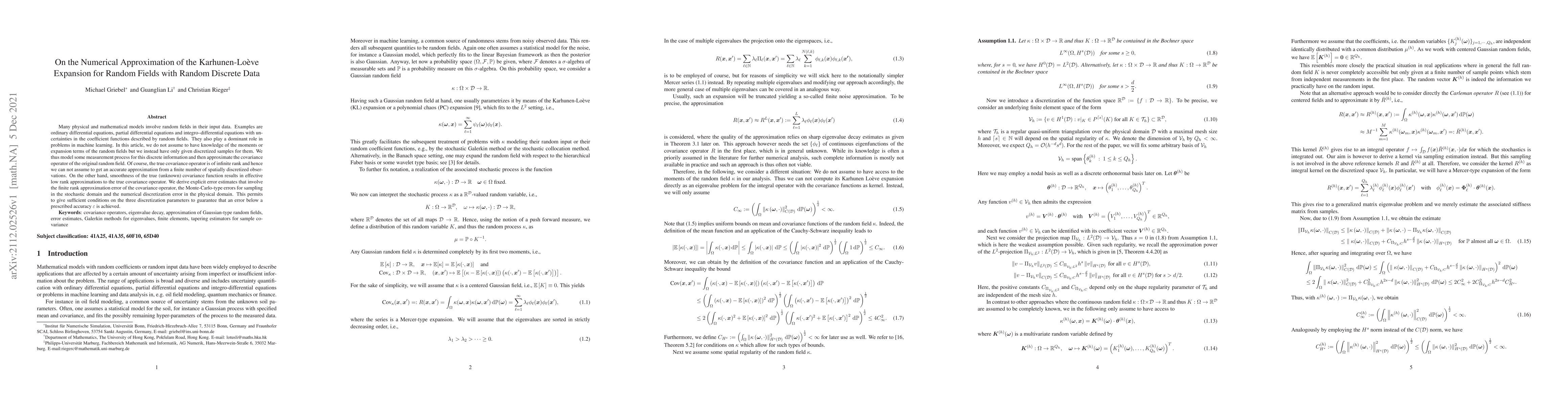 Many physical and mathematical models involve random fields in their input data. Examples are ordinary differential equations, partial differential equations and integro--differential equations with uncertainties in the coefficient functions described by random fields. They also play a dominant role in problems in machine learning. In this article, we do not assume to have knowledge of the moments or expansion terms of the random fields but we instead have only given discretized samples for them. We thus model some measurement process for this discrete information and then approximate the covariance operator of the original random field. Of course, the true covariance operator is of infinite rank and hence we can not assume to get an accurate approximation from a finite number of spatially discretized observations. On the other hand, smoothness of the true (unknown) covariance function results in effective low rank approximations to the true covariance operator. We derive explicit error estimates that involve the finite rank approximation error of the covariance operator, the Monte-Carlo-type errors for sampling in the stochastic domain and the numerical discretization error in the physical domain. This permits to give sufficient conditions on the three discretization parameters to guarantee that an error below a prescribed accuracy $\varepsilon$ is achieved.