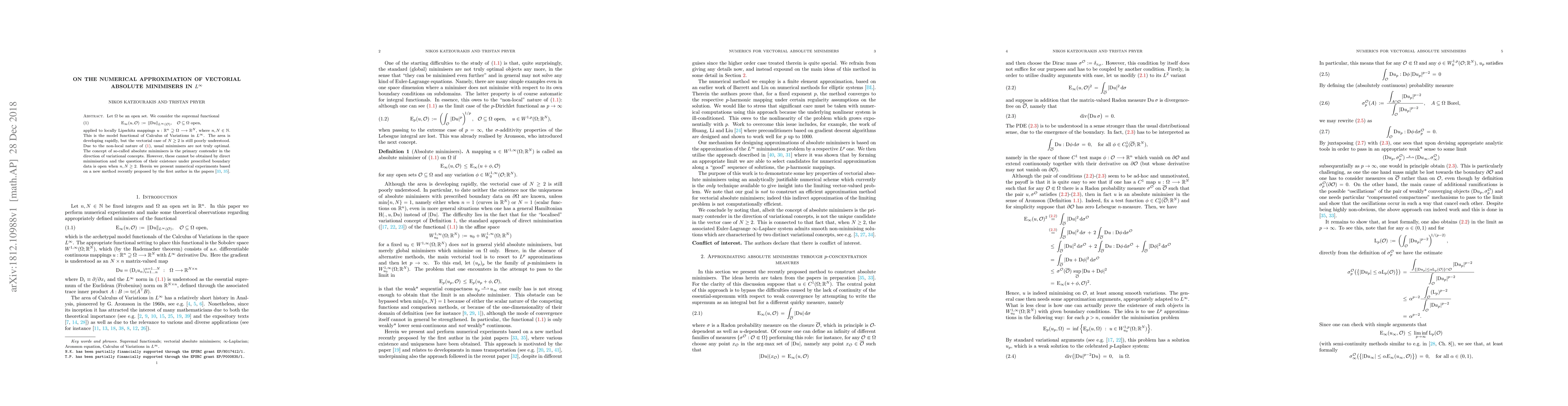Let $\Omega$ be an open set. We consider the supremal functional \[ \tag{1} \label{1} \ \ \ \ \ \ \mathrm{E}_\infty (u,\mathcal{O})\, :=\, \| \mathrm D u \|_{L^\infty( \mathcal{O} )}, \ \ \ \mathcal{O} \subseteq \Omega \text{ open}, \] applied to locally Lipschitz mappings $u : \mathbb R^n \supseteq \Omega \longrightarrow \mathbb R^N$, where $n,N\in \mathbb N$. This is the model functional of Calculus of Variations in $L^\infty$. The area is developing rapidly, but the vectorial case of $N\geq 2$ is still poorly understood. Due to the non-local nature of \eqref{1}, usual minimisers are not truly optimal. The concept of so-called absolute minimisers is the primary contender in the direction of variational concepts. However, these cannot be obtained by direct minimisation and the question of their existence under prescribed boundary data is open when $n,N\geq 2$. Herein we present numerical experiments based on a new method recently proposed by the first author in the papers [33, 35].