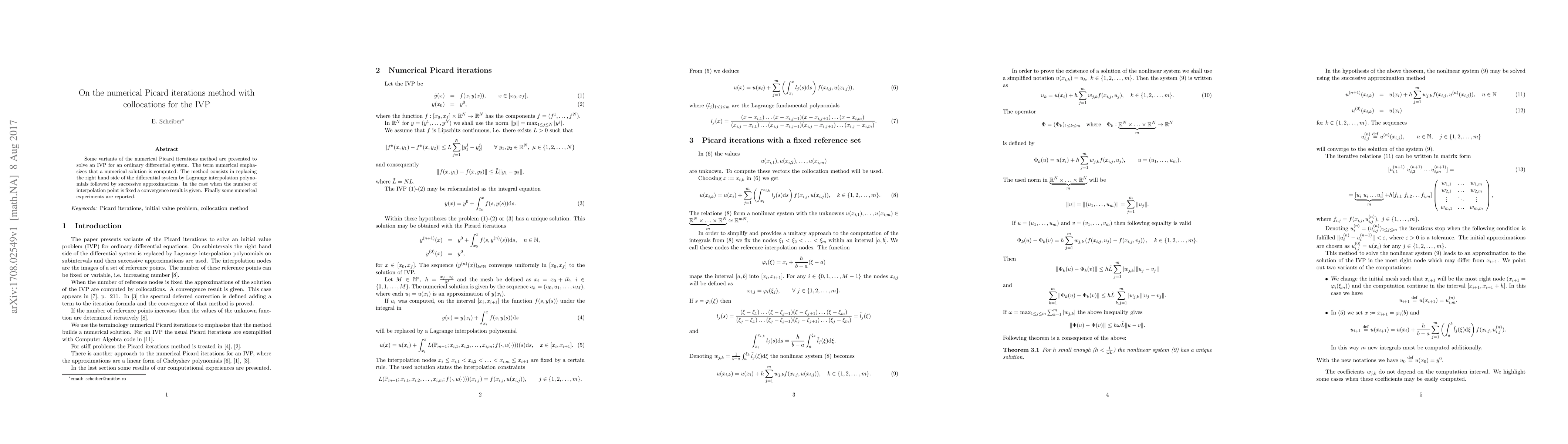Some variants of the numerical Picard iterations method are presented to solve an IVP for an ordinary differential system. The term numerical emphasizes that a numerical solution is computed. The method consists in replacing the right hand side of the differential system by Lagrange interpolation polynomials followed by successive approximations. In the case when the number of interpolation point is fixed a convergence result is given. Finally some numerical experiments are reported.