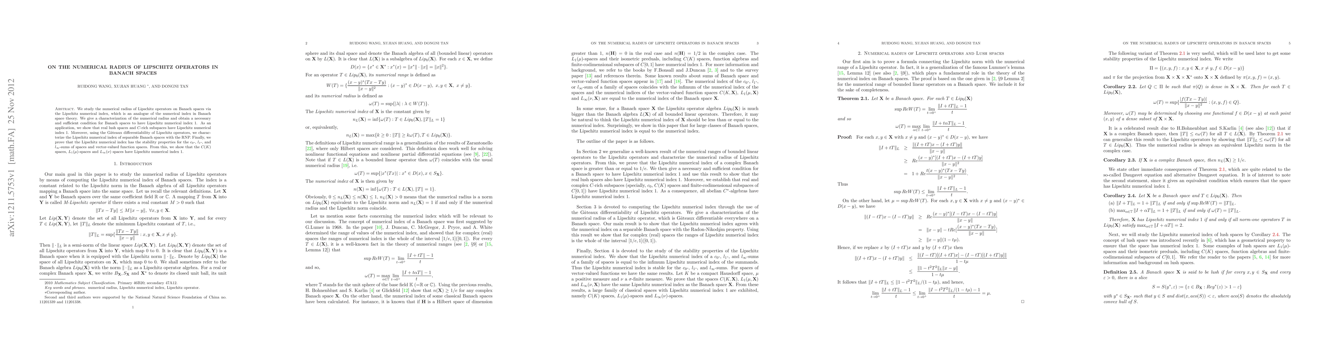 This paper investigates the numerical radius of Lipschitz operators in Banach spaces through the Lipschitz numerical index, providing a characterization and necessary/sufficient conditions for index 1. It applies these findings to real lush spaces and $C$-rich subspaces, and extends the results to separable Banach spaces with the RNP, concluding with stability properties for various function spaces.