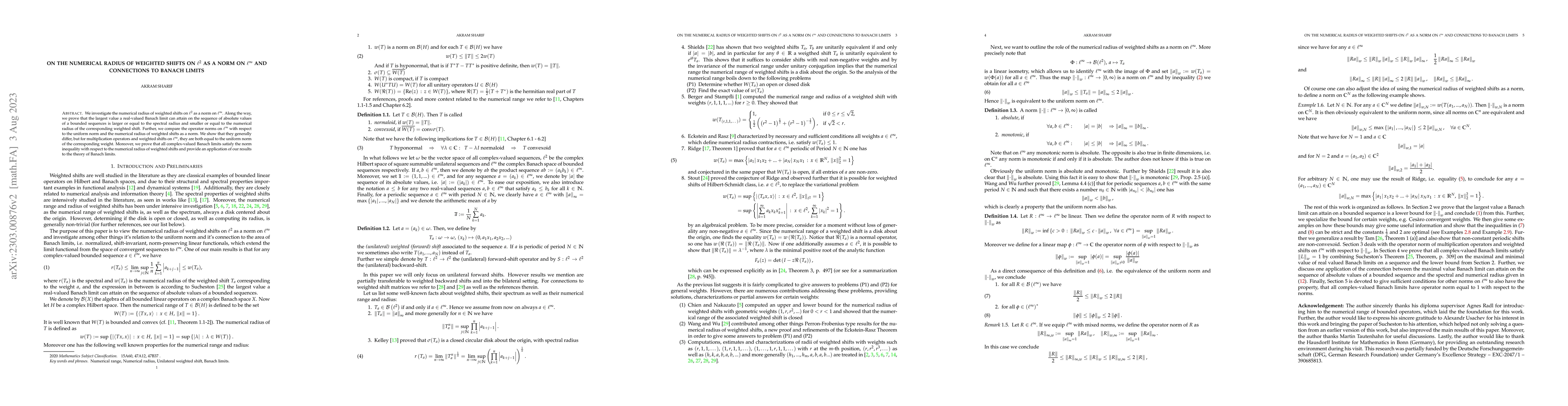 We investigate the numerical radius of weighted shifts on $\ell^{2}$ as a norm on $\ell^{\infty}$. Along the way, we prove that the largest value a Banach limit can attain on the sequence of absolute values of a bounded sequences is larger or equal to the spectral radius and smaller or equal to the numerical radius of the corresponding weighted shift. Further, we compare the operator norms on $\ell^{\infty}$ with respect to the uniform norm and the numerical radius of weighted shifts as a norm. We show that they generally differ, but for multiplication operators and weighted shifts on $\ell^{\infty}$, they are both equal to the uniform norm of the corresponding weight. Moreover, we prove that all complex-valued Banach limits satisfy the norm inequality with respect to the numerical radius of weighted shifts and provide an application of our results to the theory of Banach limits.