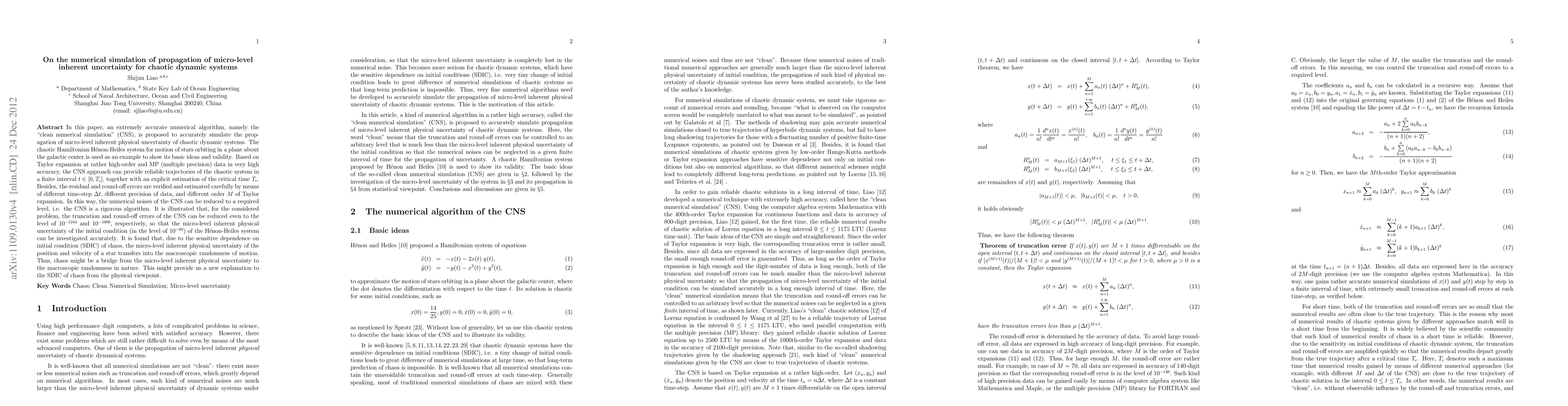 In this paper, an extremely accurate numerical algorithm, namely the "clean numerical simulation" (CNS), is proposed to accurately simulate the propagation of micro-level inherent physical uncertainty of chaotic dynamic systems. The chaotic Hamiltonian H\'{e}non-Heiles system for motion of stars orbiting in a plane about the galactic center is used as an example to show its basic ideas and validity. Based on Taylor expansion at rather high-order and MP (multiple precision) data in very high accuracy, the CNS approach can provide reliable trajectories of the chaotic system in a finite interval $t\in[0,T_c]$, together with an explicit estimation of the critical time $T_c$. Besides, the residual and round-off errors are verified and estimated carefully by means of different time-step $\Delta t$, different precision of data, and different order $M$ of Taylor expansion. In this way, the numerical noises of the CNS can be reduced to a required level, i.e. the CNS is a rigorous algorithm. It is illustrated that, for the considered problem, the truncation and round-off errors of the CNS can be reduced even to the level of $10^{-1244}$ and $10^{-1000}$, respectively, so that the micro-level inherent physical uncertainty of the initial condition (in the level of $10^{-60}$) of the H\'{e}non-Heiles system can be investigated accurately. It is found that, due to the sensitive dependence on initial condition (SDIC) of chaos, the micro-level inherent physical uncertainty of the position and velocity of a star transfers into the macroscopic randomness of motion. Thus, chaos might be a bridge from the micro-level inherent physical uncertainty to the macroscopic randomness in nature. This might provide us a new explanation to the SDIC of chaos from the physical viewpoint.