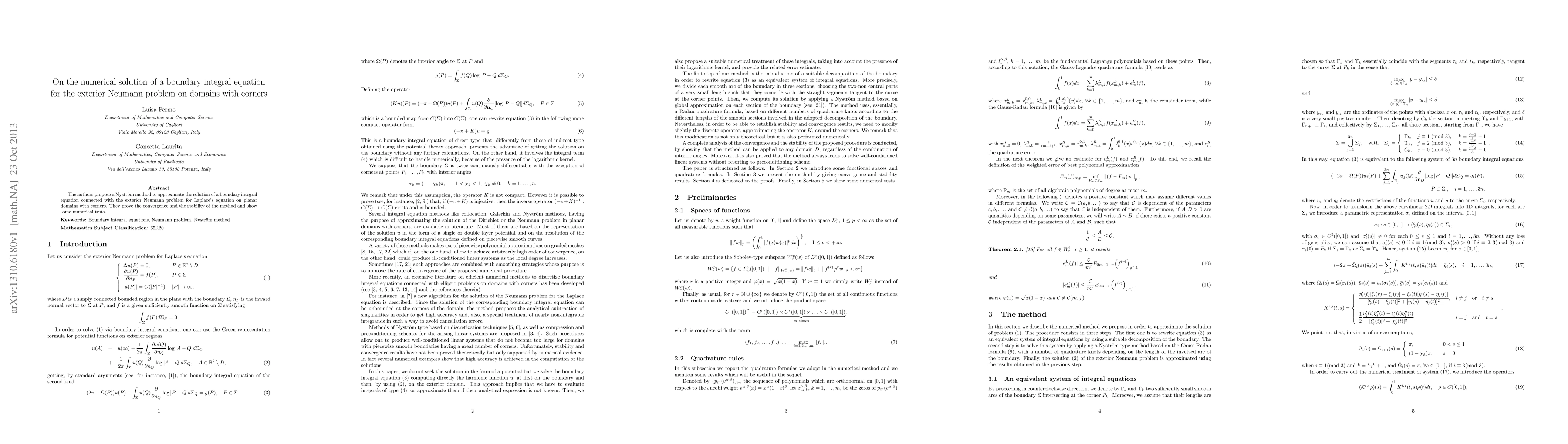 Summary: The paper introduces a Nyström method for solving a boundary integral equation related to the exterior Neumann problem for Laplace's equation on domains with corners, proving its convergence and stability, and demonstrating its effectiveness through numerical tests.