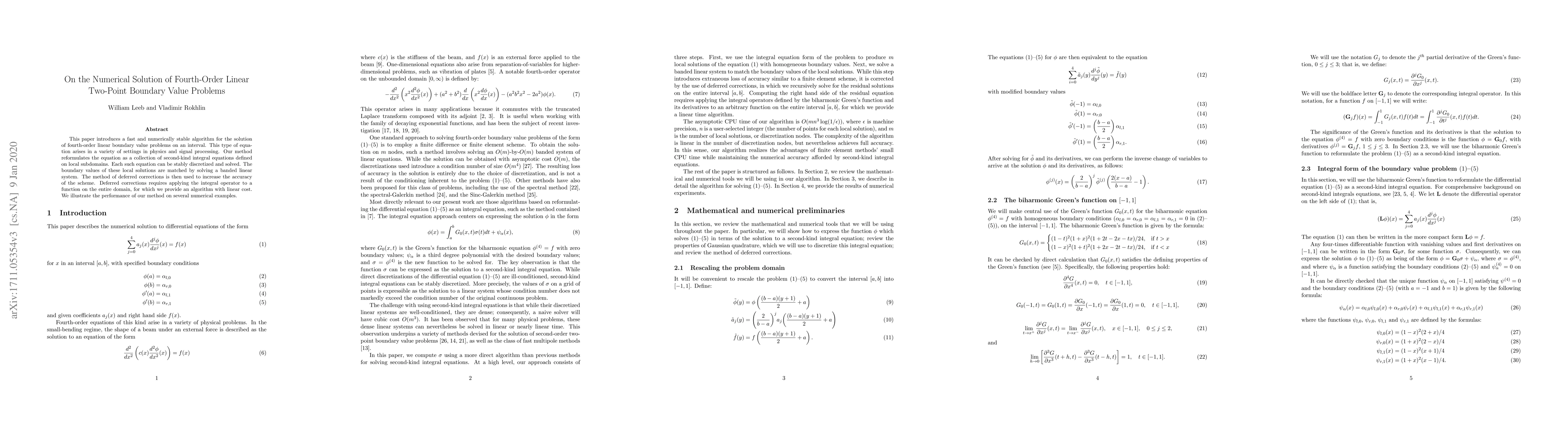 A new algorithm is introduced for solving fourth-order linear boundary value problems with high accuracy and stability, using a combination of integral equations and deferred corrections.