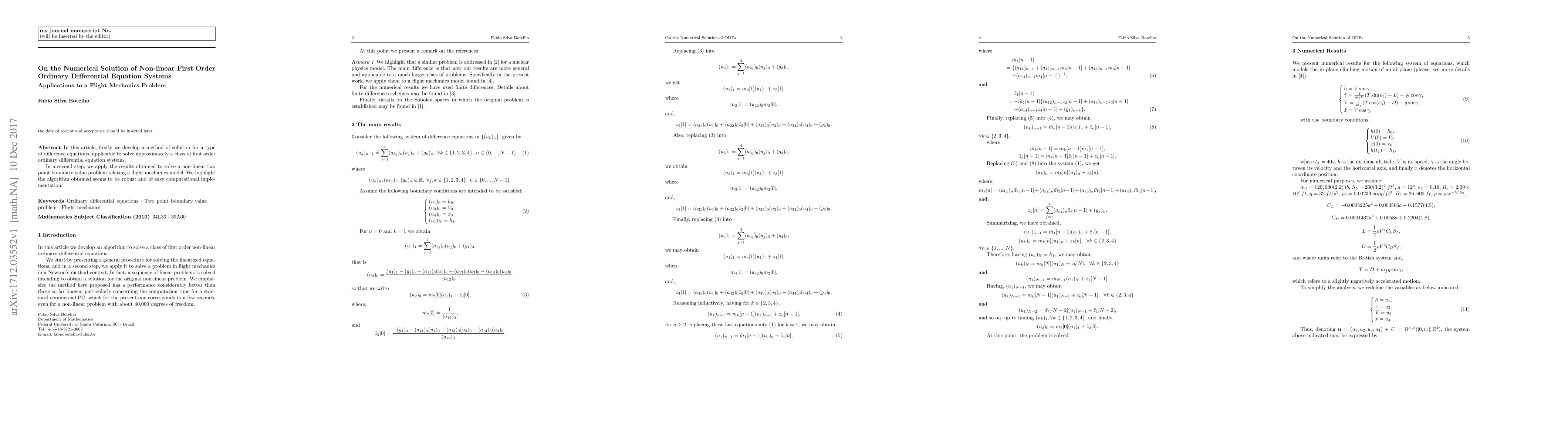 The main technical contribution is the development of a difference equation-based method for solving first-order ordinary differential equation systems, along with its application to a flight mechanics model.