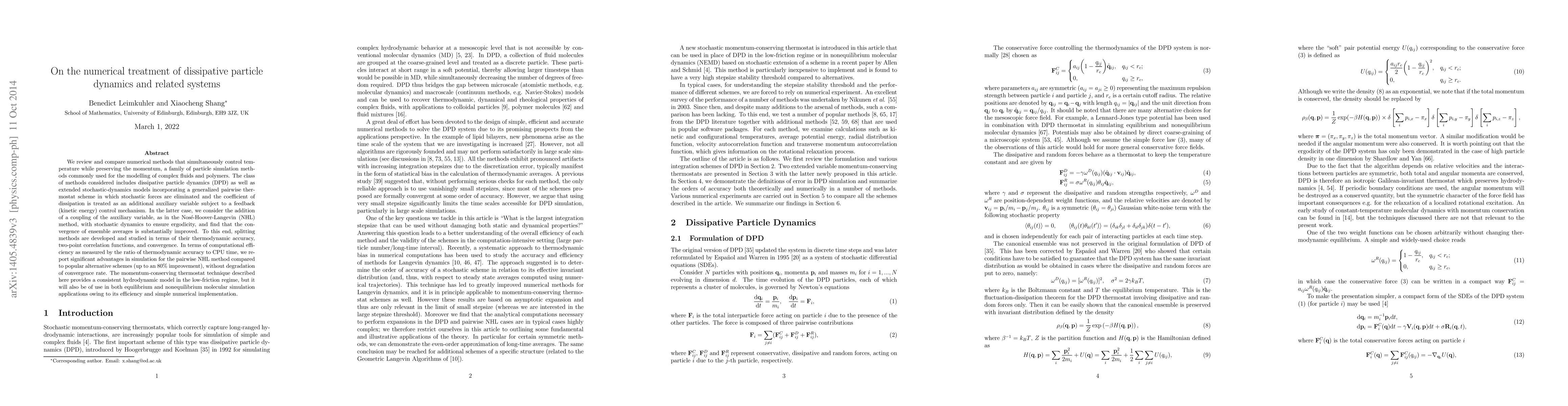 We review and compare numerical methods that simultaneously control temperature while preserving the momentum, a family of particle simulation methods commonly used for the modelling of complex fluids and polymers. The class of methods considered includes dissipative particle dynamics (DPD) as well as extended stochastic-dynamics models incorporating a generalized pairwise thermostat scheme in which stochastic forces are eliminated and the coefficient of dissipation is treated as an additional auxiliary variable subject to a feedback (kinetic energy) control mechanism. In the latter case, we consider the addition of a coupling of the auxiliary variable, as in the Nos\'{e}-Hoover-Langevin (NHL) method, with stochastic dynamics to ensure ergodicity, and find that the convergence of ensemble averages is substantially improved. To this end, splitting methods are developed and studied in terms of their thermodynamic accuracy, two-point correlation functions, and convergence. In terms of computational efficiency as measured by the ratio of thermodynamic accuracy to CPU time, we report significant advantages in simulation for the pairwise NHL method compared to popular alternative schemes (up to an 80\% improvement), without degradation of convergence rate. The momentum-conserving thermostat technique described here provides a consistent hydrodynamic model in the low-friction regime, but it will also be of use in both equilibrium and nonequilibrium molecular simulation applications owing to its efficiency and simple numerical implementation.