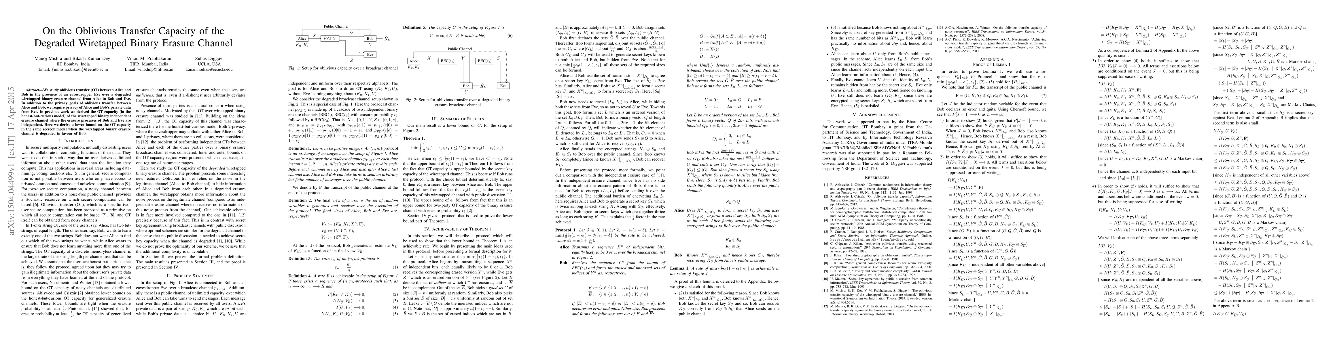 This paper investigates the oblivious transfer capacity in a degraded wiretapped binary erasure channel where Alice and Bob aim to securely transfer information while maintaining privacy from eavesdropper Eve. The study derives a lower bound for the oblivious transfer capacity under the condition that the channel is degraded in favor of Bob.