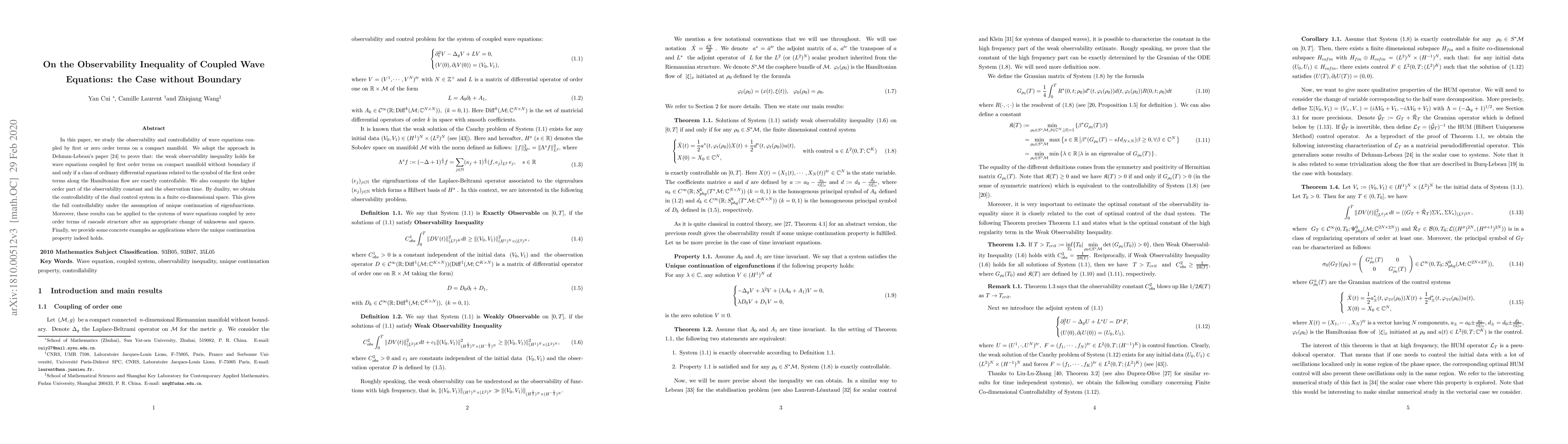 This paper investigates the observability and controllability of coupled wave equations on a compact manifold without boundary, proving that weak observability holds if related ordinary differential equations are exactly controllable. It also computes observability constants and provides applications to cascade structures.